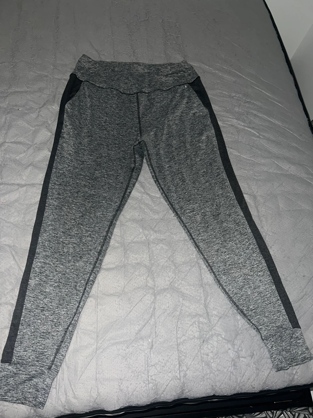 These leggings feature a comfortable marled grey fabric with contrasting black side panels. The waistband is elasticized for a snug fit. They're great for casual wear or workouts!