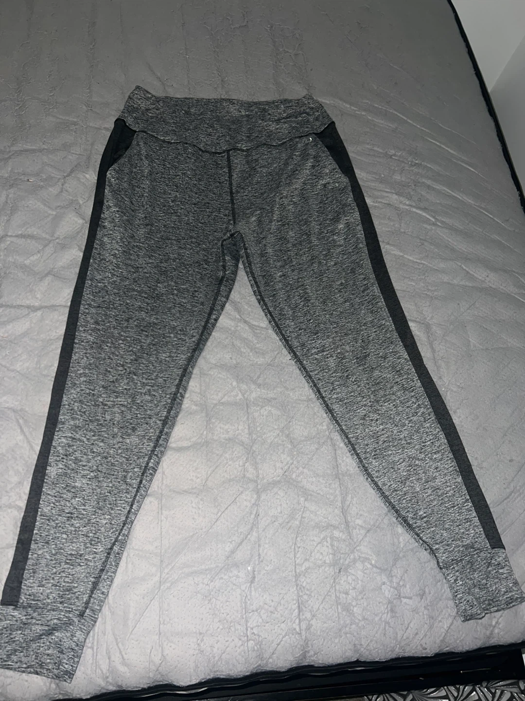 These leggings feature a comfortable marled grey fabric with contrasting black side panels. The waistband is elasticized for a snug fit. They're great for casual wear or workouts!