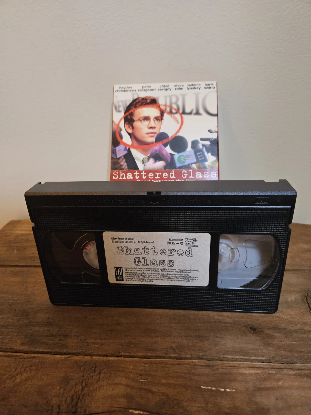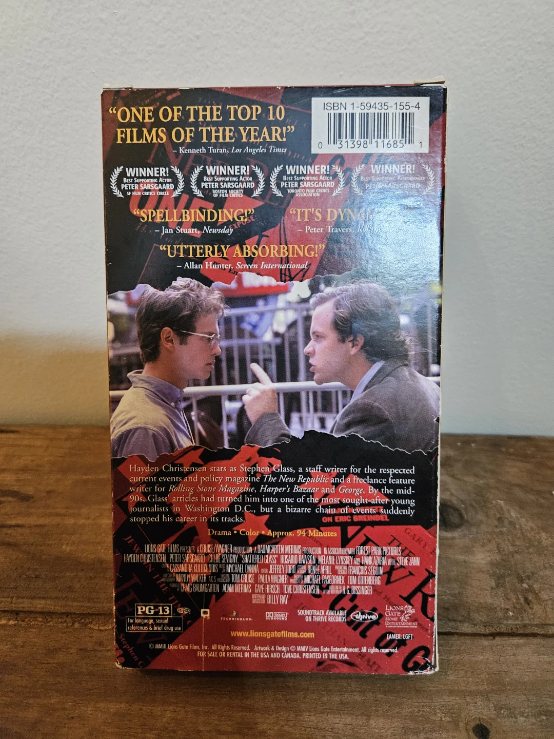 Selling a VHS copy of Shattered Glass! It's a drama about the true story that shocked the nation. Starring Hayden Christensen, Peter Sarsgaard, and Chloë Sevigny. It runs for approximately 94 minutes