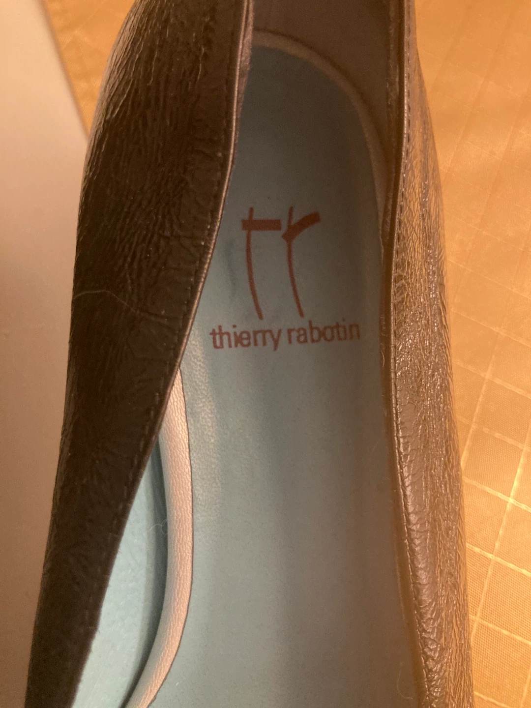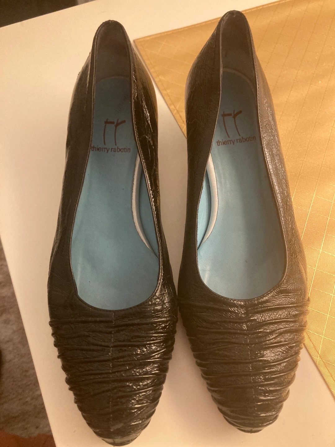 These elegant Thierry Rabotin heels are crafted from shiny black leather with a ruched detail on the toe. They feature a comfortable light blue interior. A classic addition to any wardrobe!