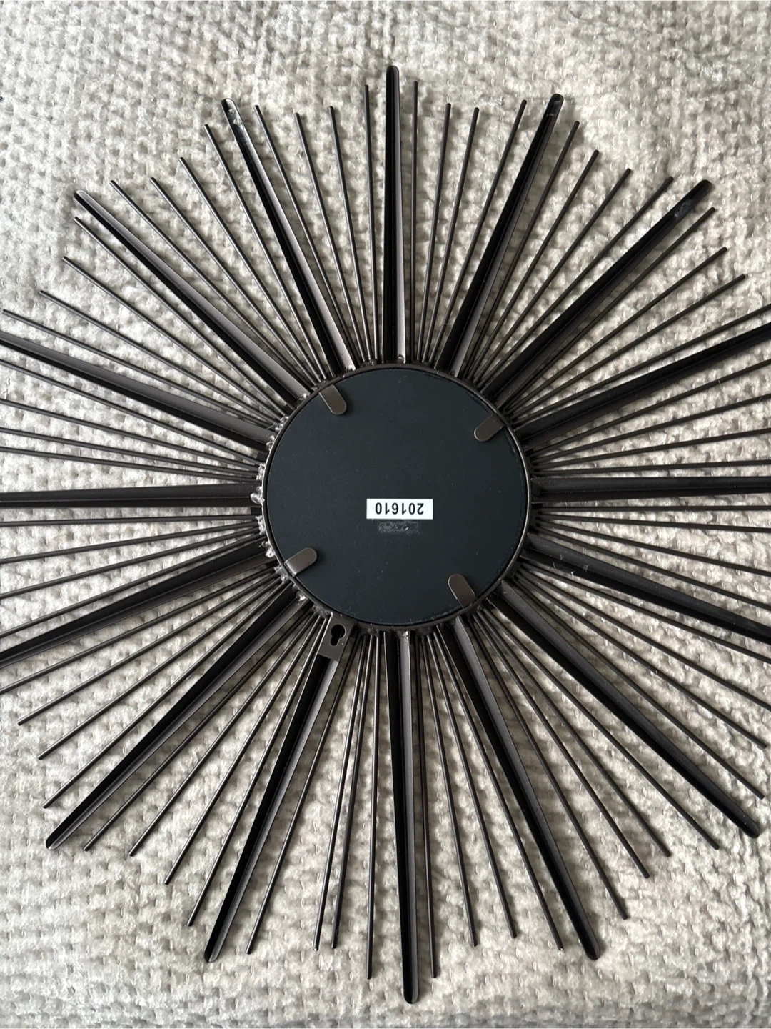 A striking sunburst mirror. It's made of dark metal with a central reflective surface. This piece adds a bold accent to any room!