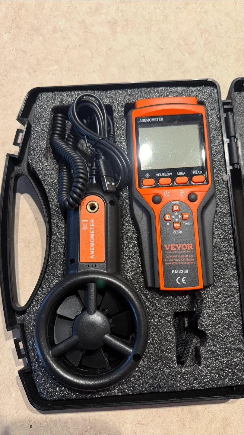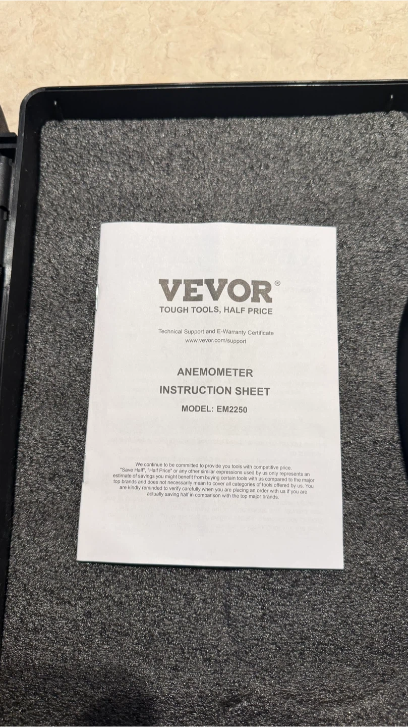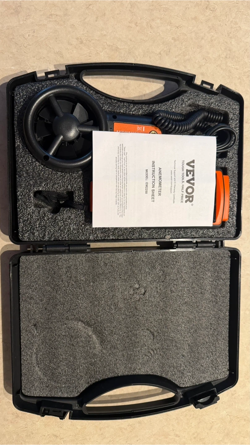 This VEVOR anemometer measures wind speed and temperature. It comes with the handheld unit, impeller, and instruction sheet. It's all stored in a protective carrying case for easy transport. It's useful for weather monitoring and outdoor activities.