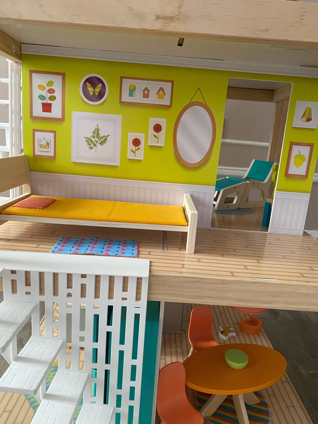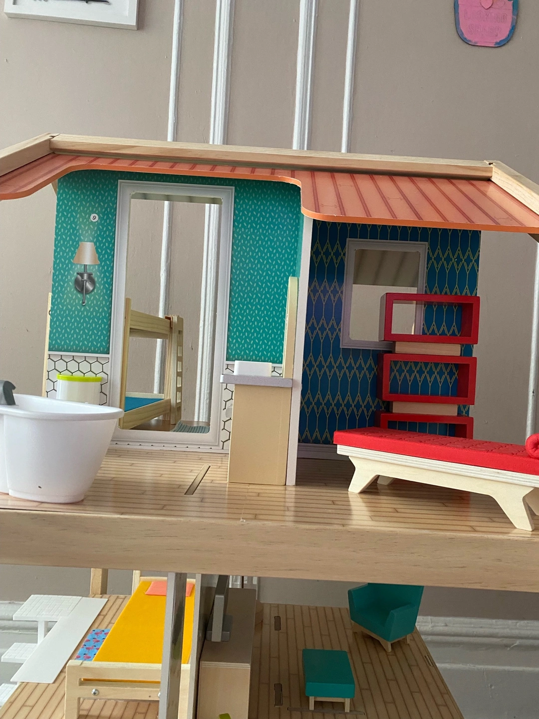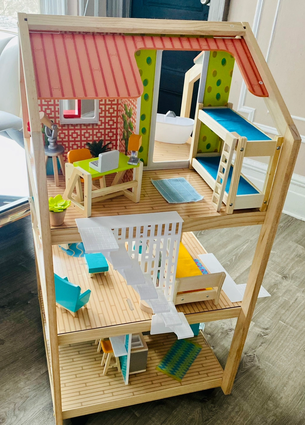 MID-CENTURY DESIGN: Full of bright bold colors and trendy patterns, this dollhouse has a mod style that really stands out.