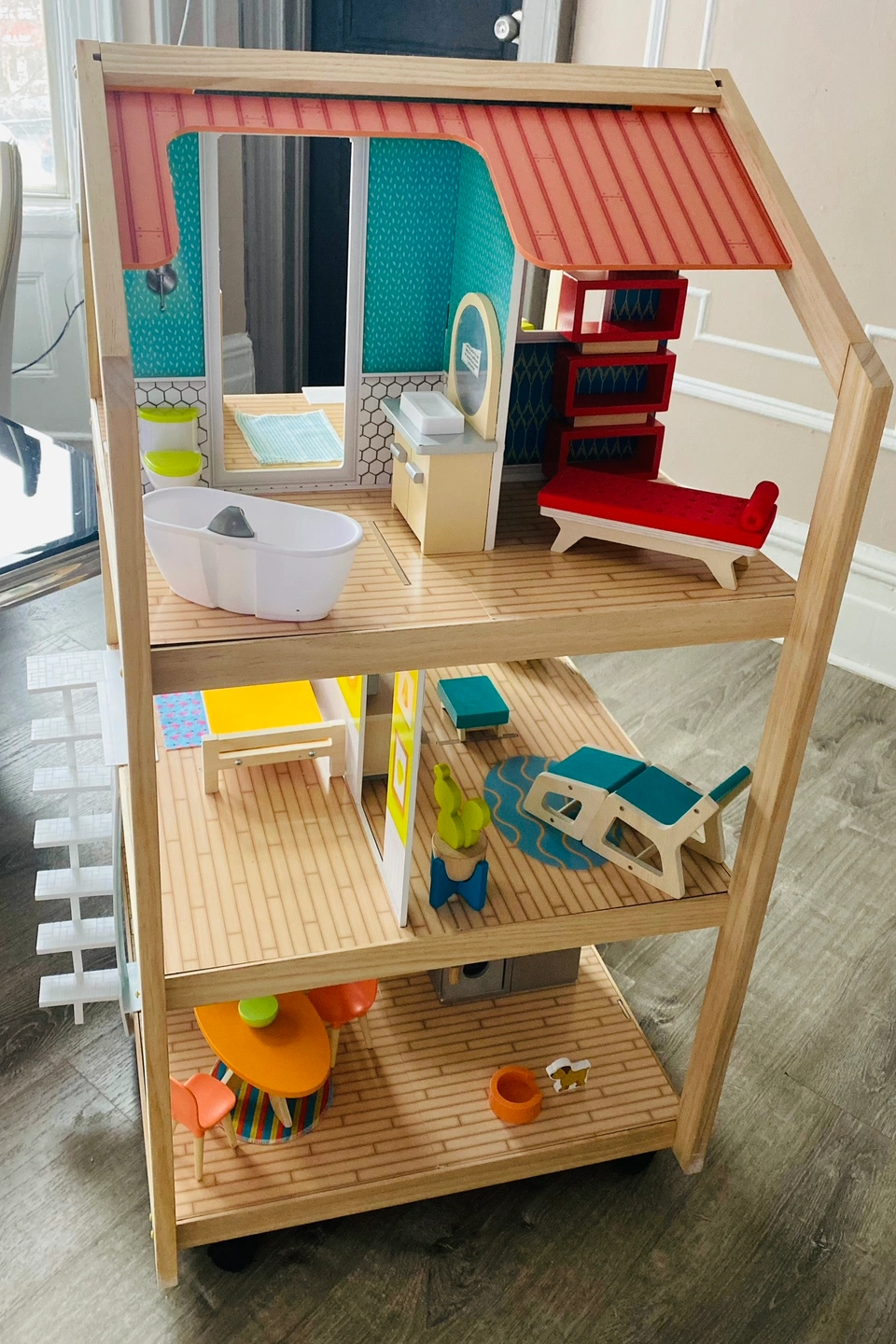 ON WHEELS: Move wooden dollhouse from room to room so play can go wherever you are. Easy for kids to push and spin around on their own.