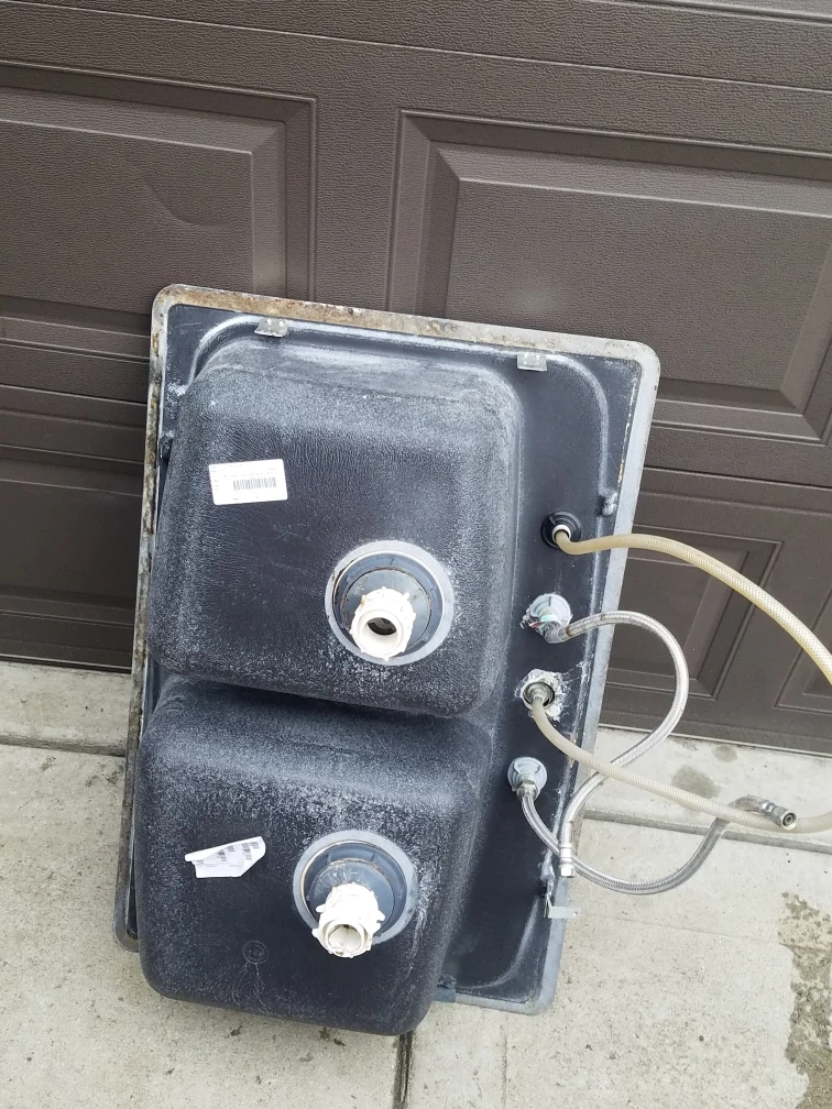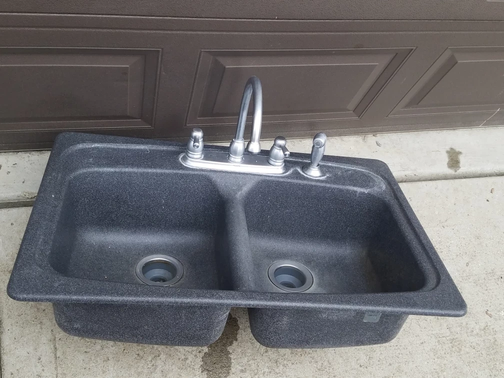 This is a double bowl kitchen sink. It's dark gray with a granite-like texture. The sink includes a faucet with a pull-out sprayer. Ready for installation in your kitchen!