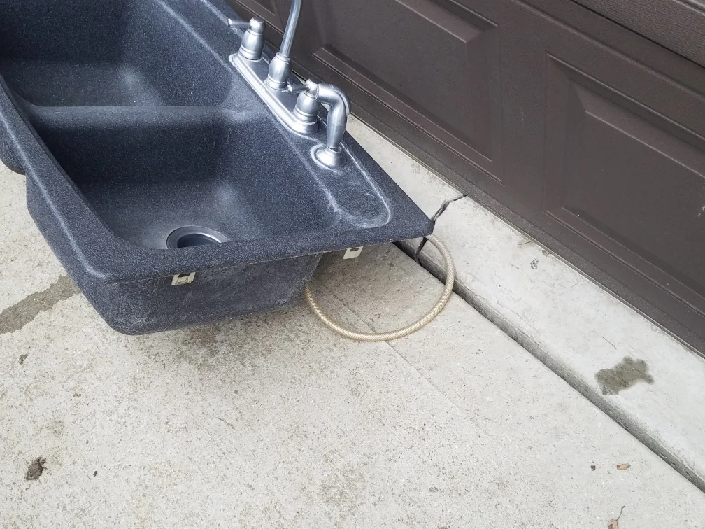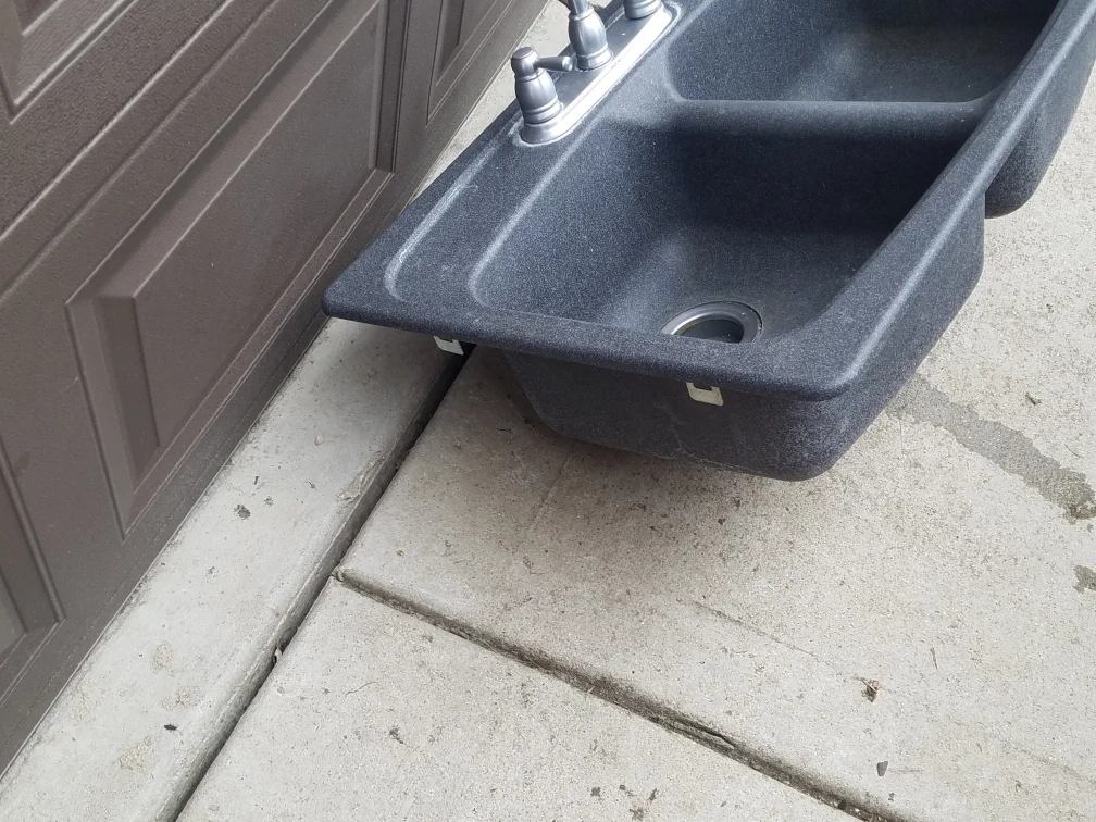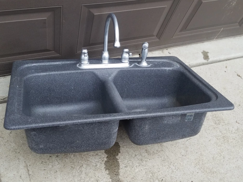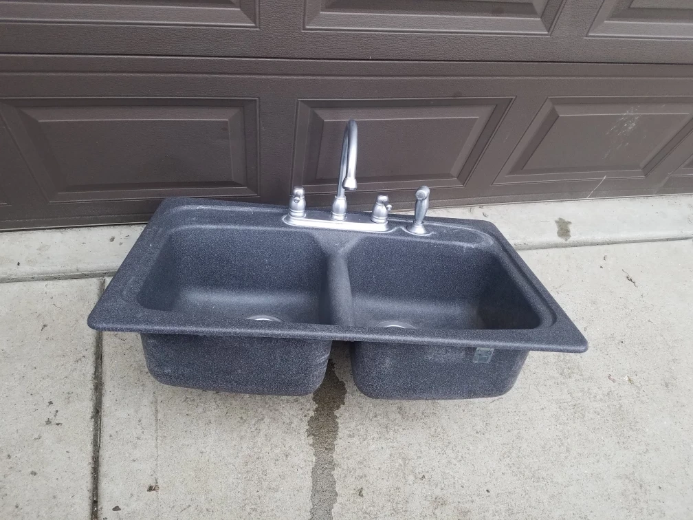 This is a double bowl kitchen sink. It's dark gray with a granite-like texture. The sink includes a faucet with a pull-out sprayer. Ready for installation in your kitchen!