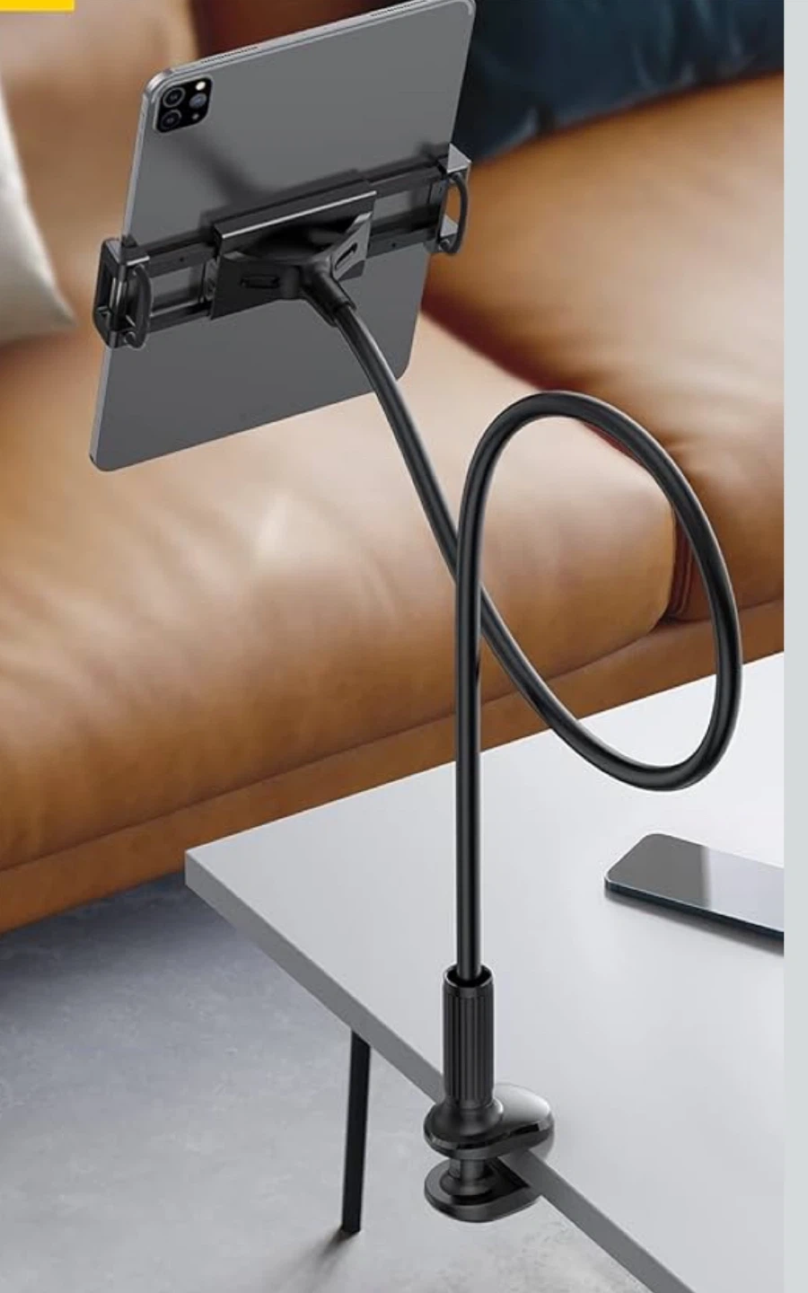 Tryone Gooseneck Tablet Holder Stand, designed to securely hold tablets ranging from 4.7 to 10.5 inches, featuring a flexible, adjustable gooseneck for optimal viewing angles, and a sturdy clamp for easy attachment to desks or beds.