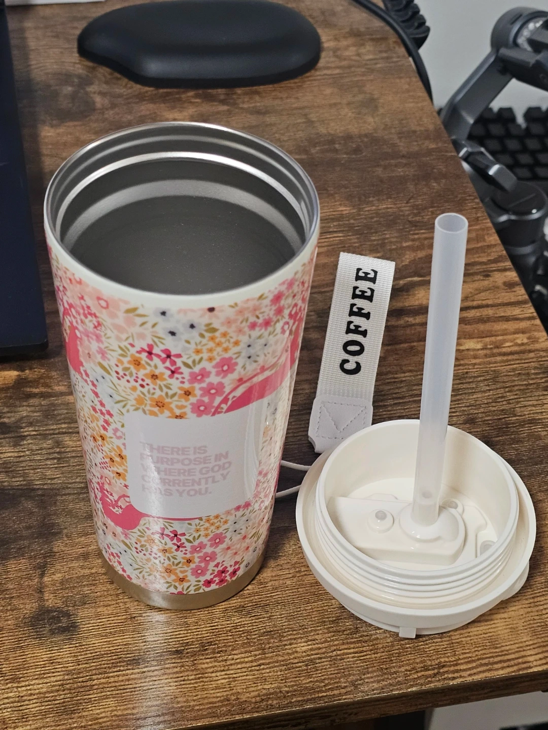 Stainless steel travel mug with a floral design and a white flip-top lid. It includes a white straw and a 'COFFEE' tag. Hand wash only, do not microwave.