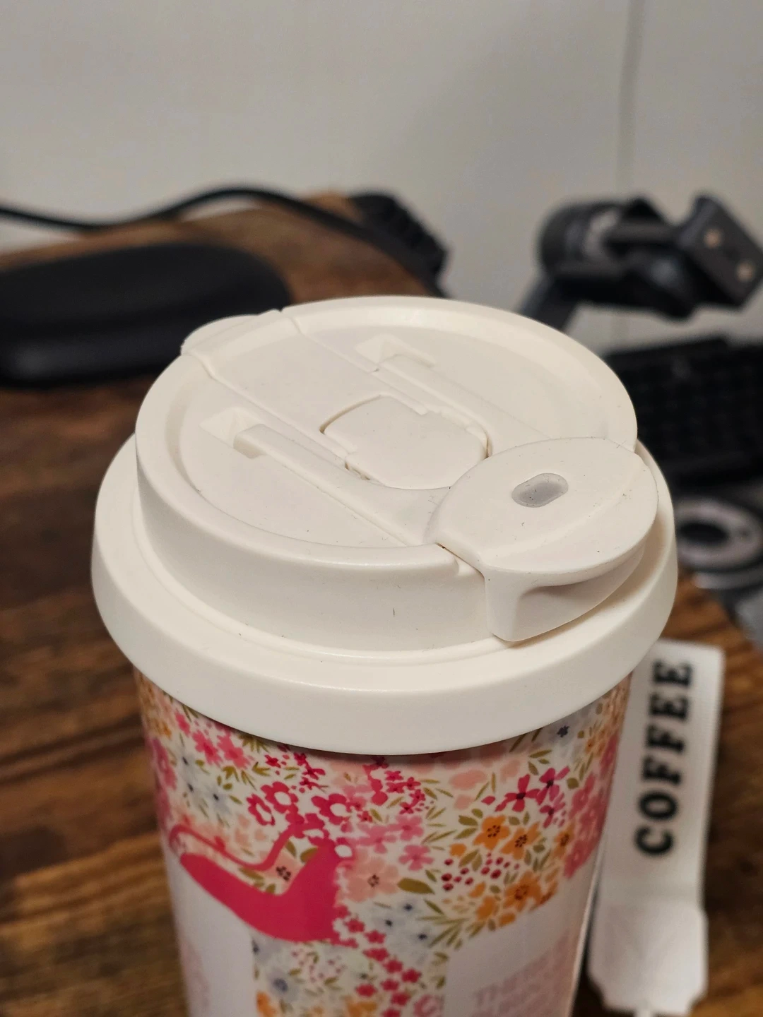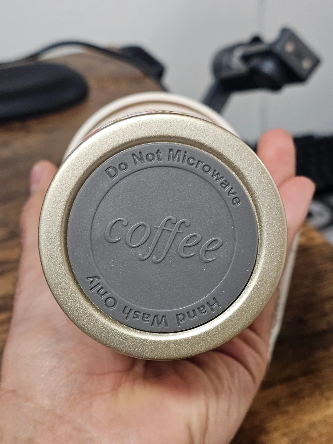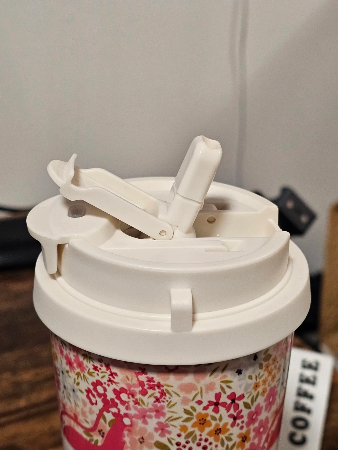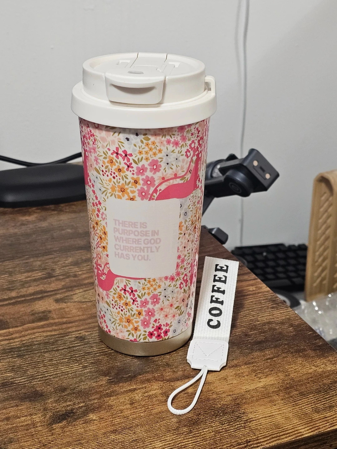 Stainless steel travel mug with a floral design and a white flip-top lid. It includes a white straw and a 'COFFEE' tag. Hand wash only, do not microwave.