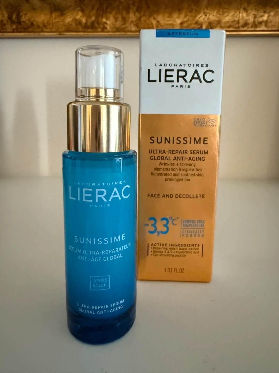 Selling a Lierac Sunissime Ultra-Repair Serum Global Anti-Aging. It's designed for face and décolleté, and works to combat wrinkles, slackening, and pigmentation irregularities. It also rehydrates and soothes the skin, prolonging your tan. Contains active ingredients like witch hazel extract, Omega 3 & 9, and hyaluronic acid. It's a 1.01 FL.OZ bottle
