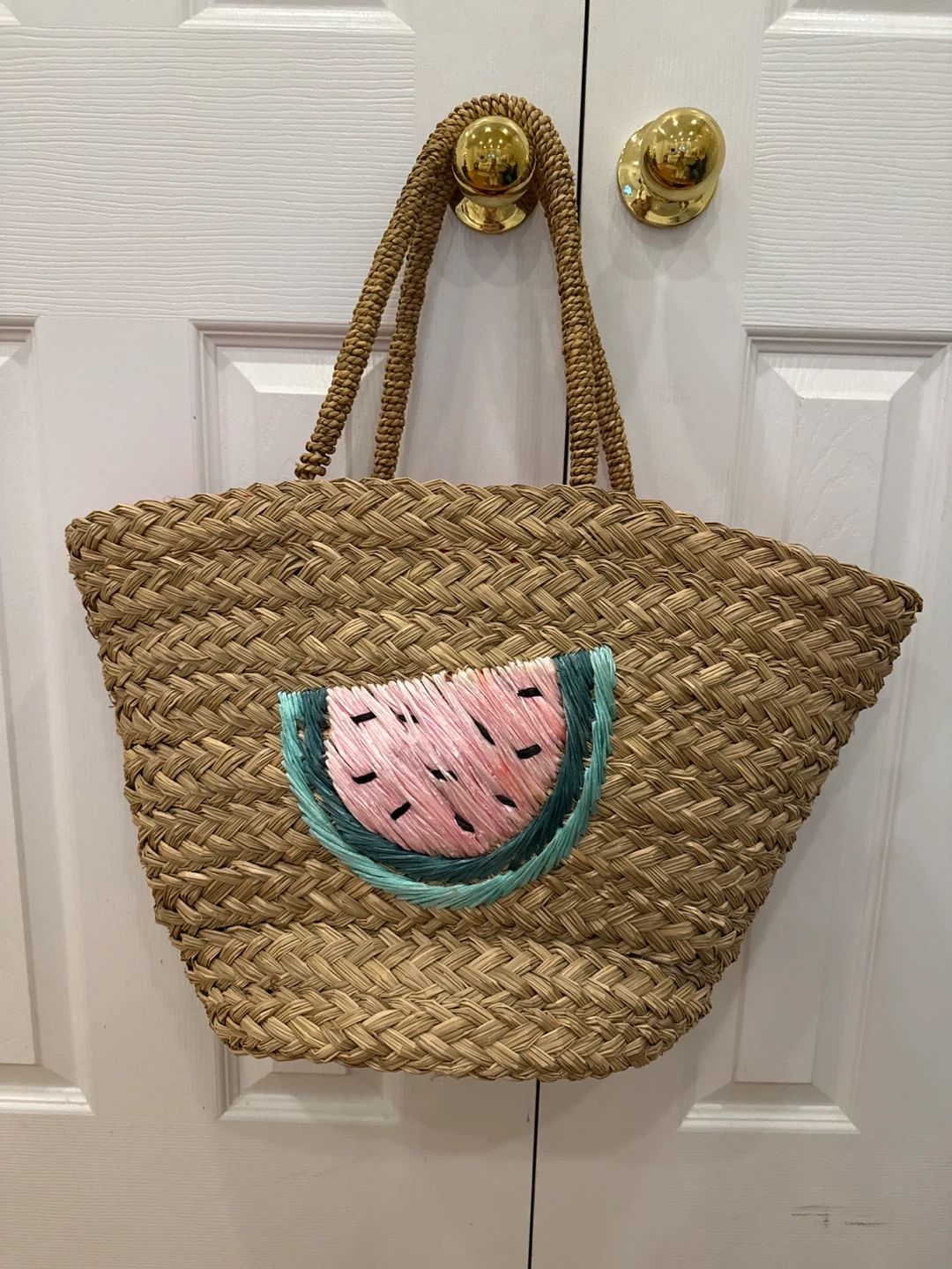 This cute straw tote bag features a woven straw construction and a fun embroidered watermelon slice on the front. It has braided rope handles for comfortable carrying. Perfect for beach trips or summer outings!