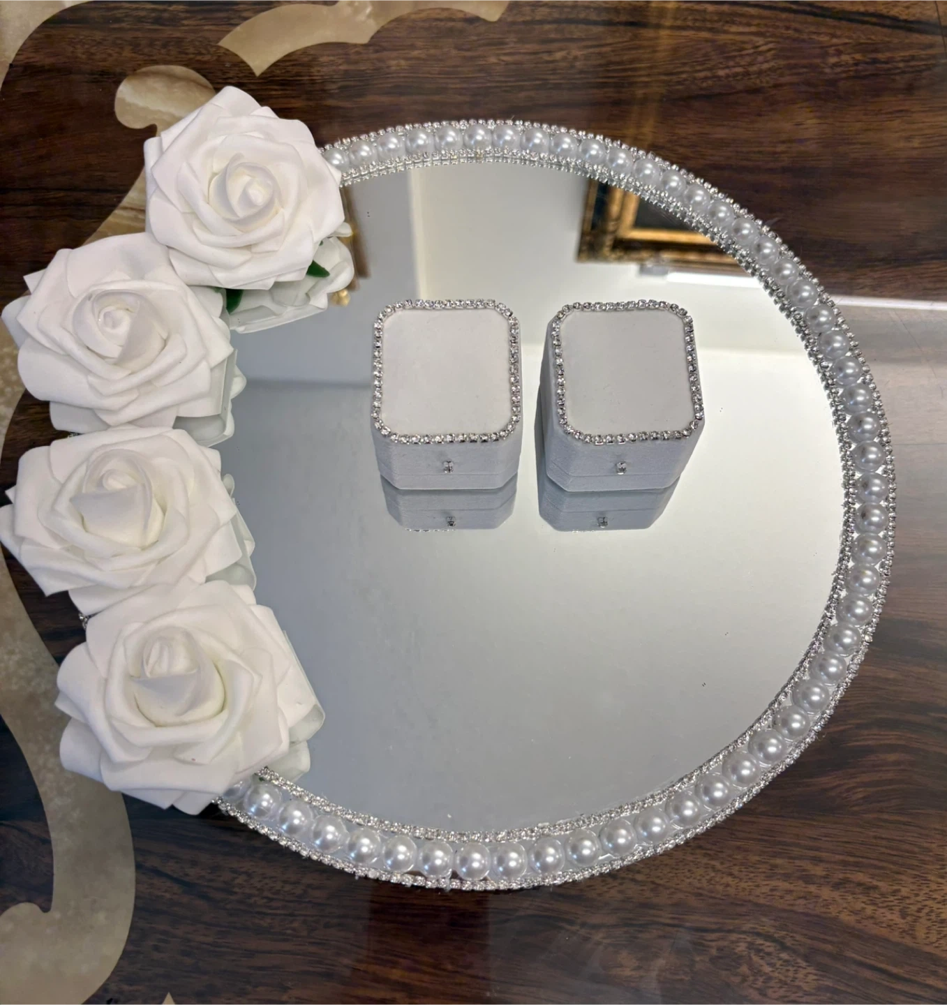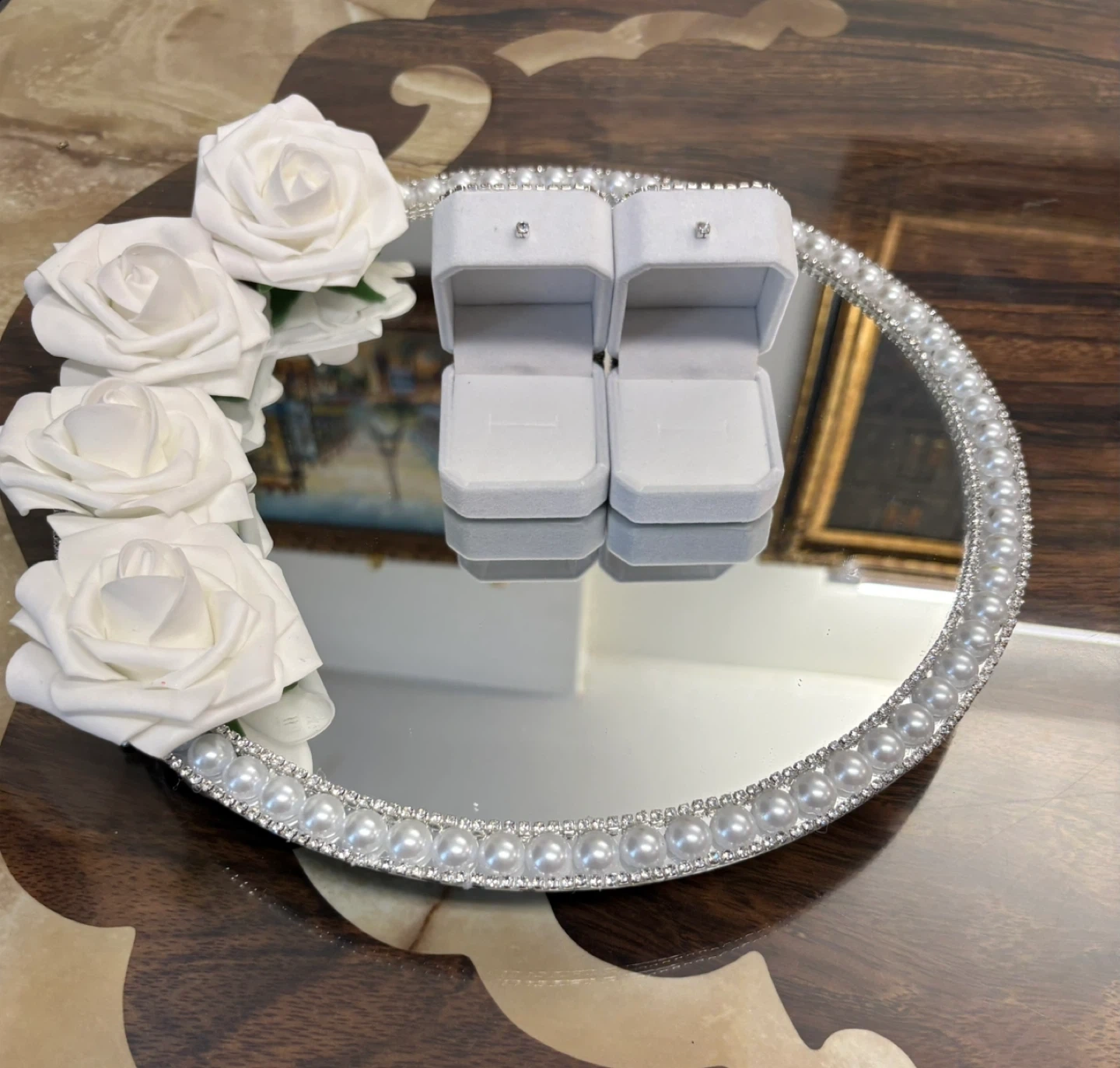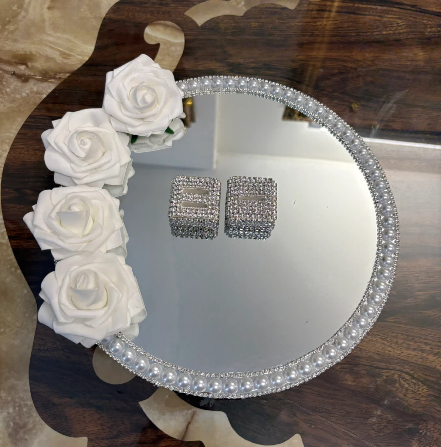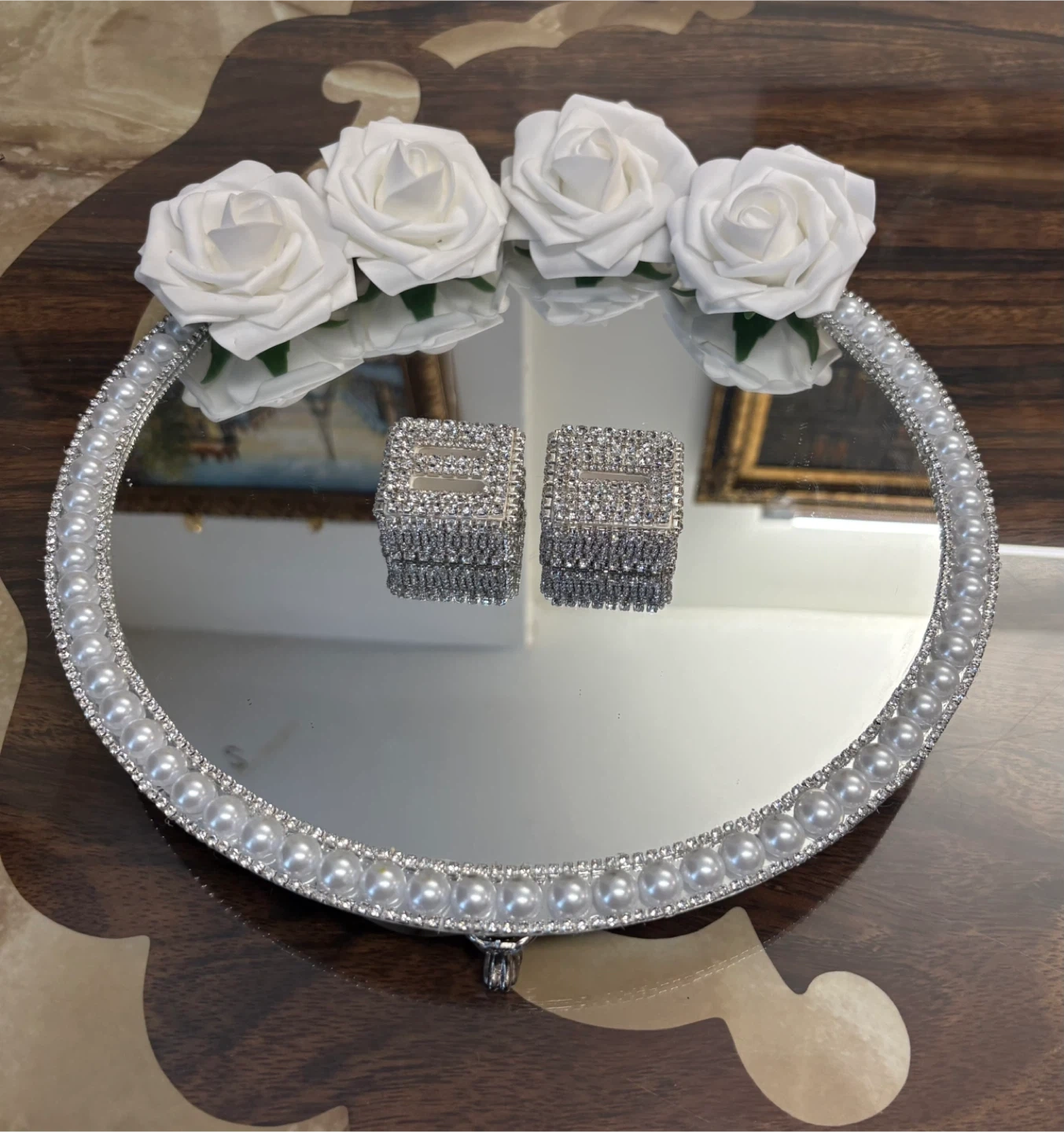 Round Mirror Tray with Faux Pearls & silver rhinestone borders