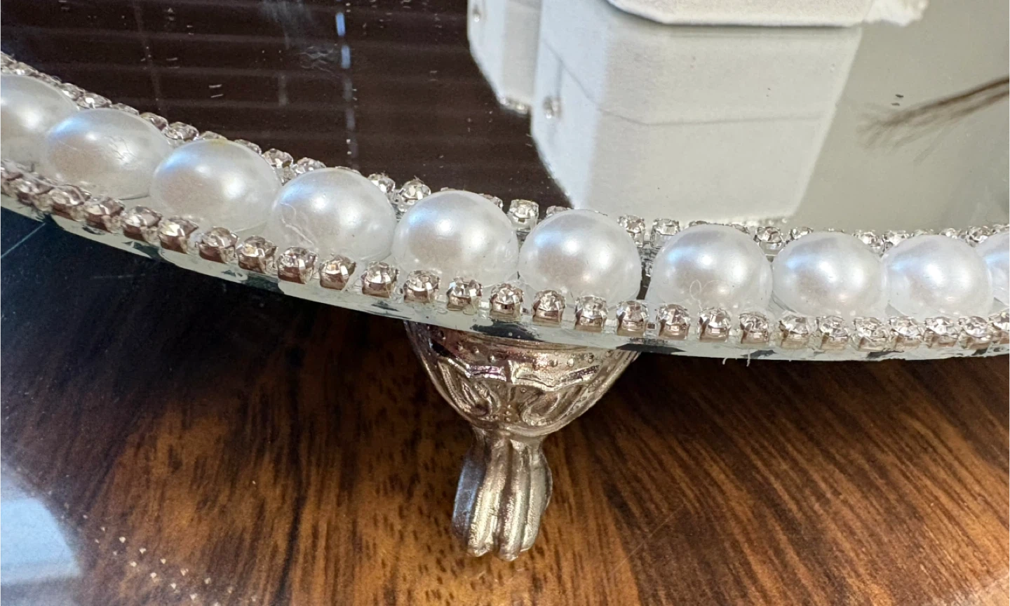 Features a reflective mirrored surface framed by a luxurious border of half faux pearls and sparkling rhinestone accents, set on a silver-tone base and white flowers.