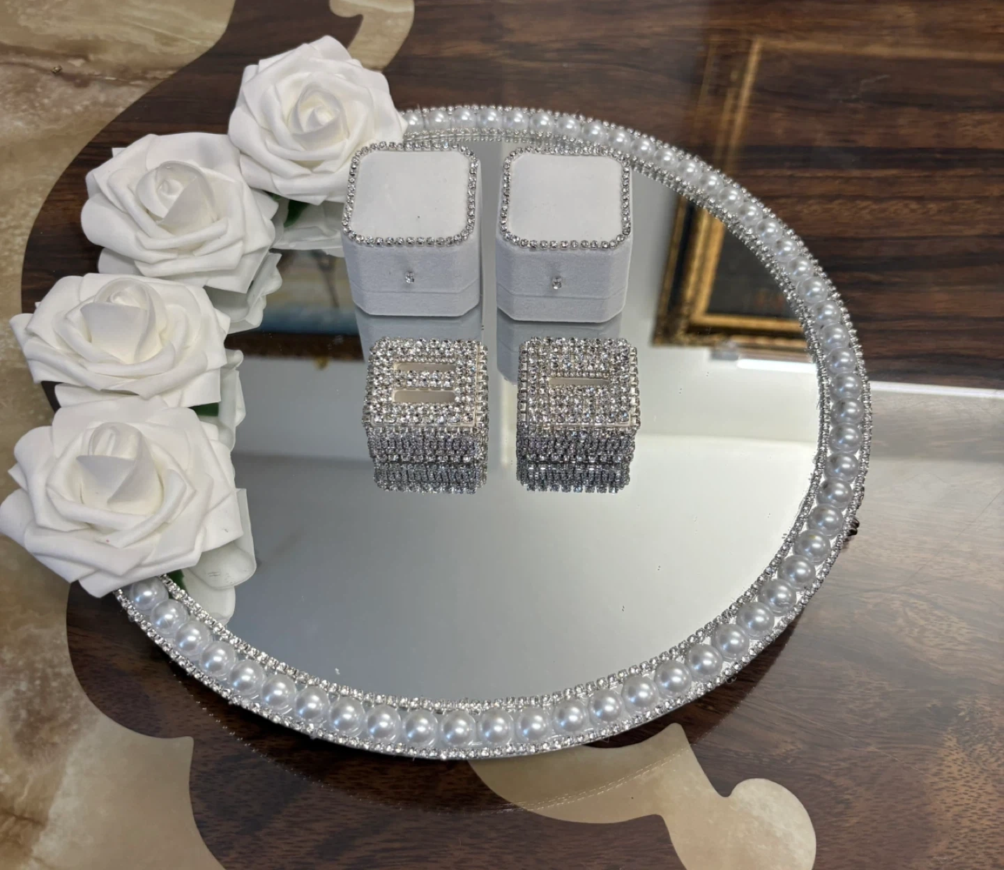 Features a reflective mirrored surface framed by a luxurious border of half faux pearls and sparkling rhinestone accents, set on a silver-tone base and white flowers.