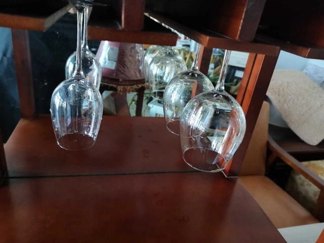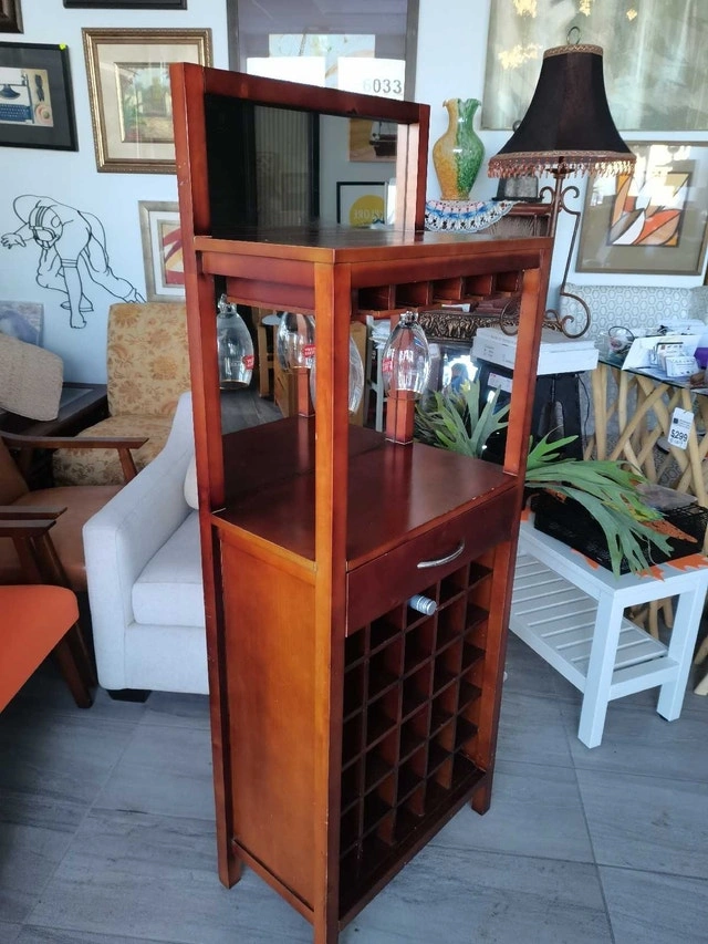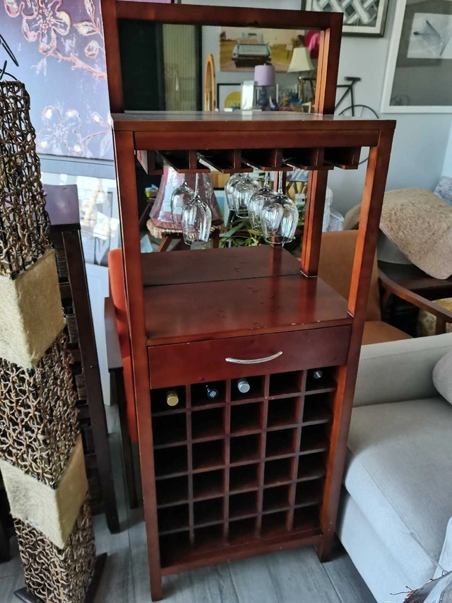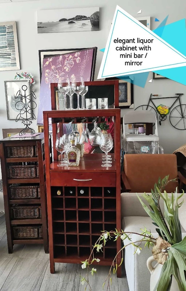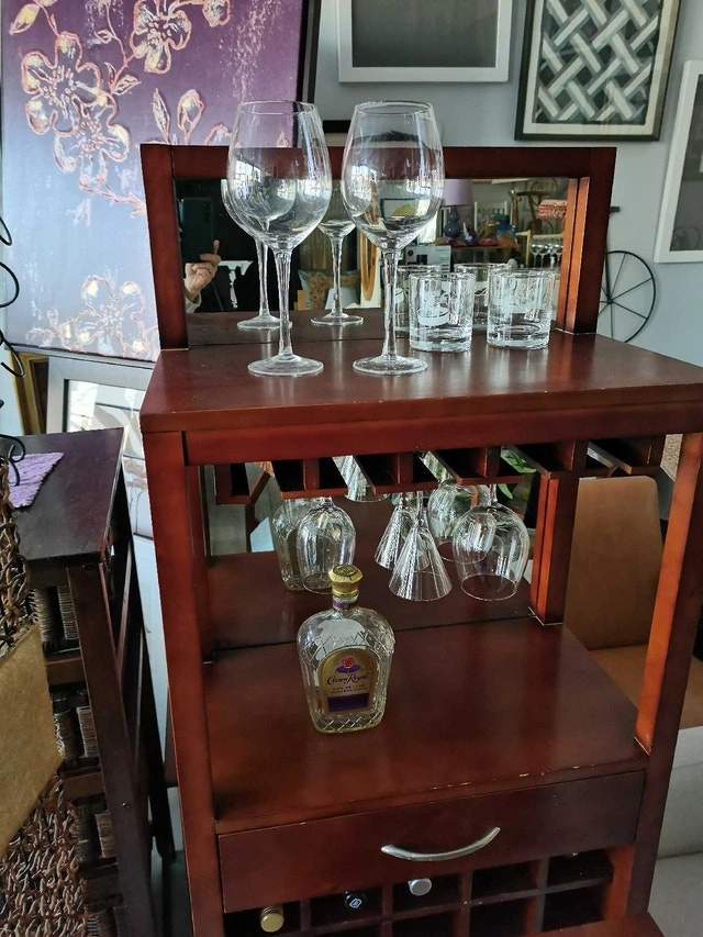 This liquor cabinet is a stylish addition to any home, featuring a built-in mini bar and mirror. The cabinet includes wine glass holders, space for wine bottles (30 bottles), and a drawer for accessories. It's perfect for entertaining or displaying your favourite spirits. It is in good condition and ready for a new home. If you're reading this, yes, it's still available!