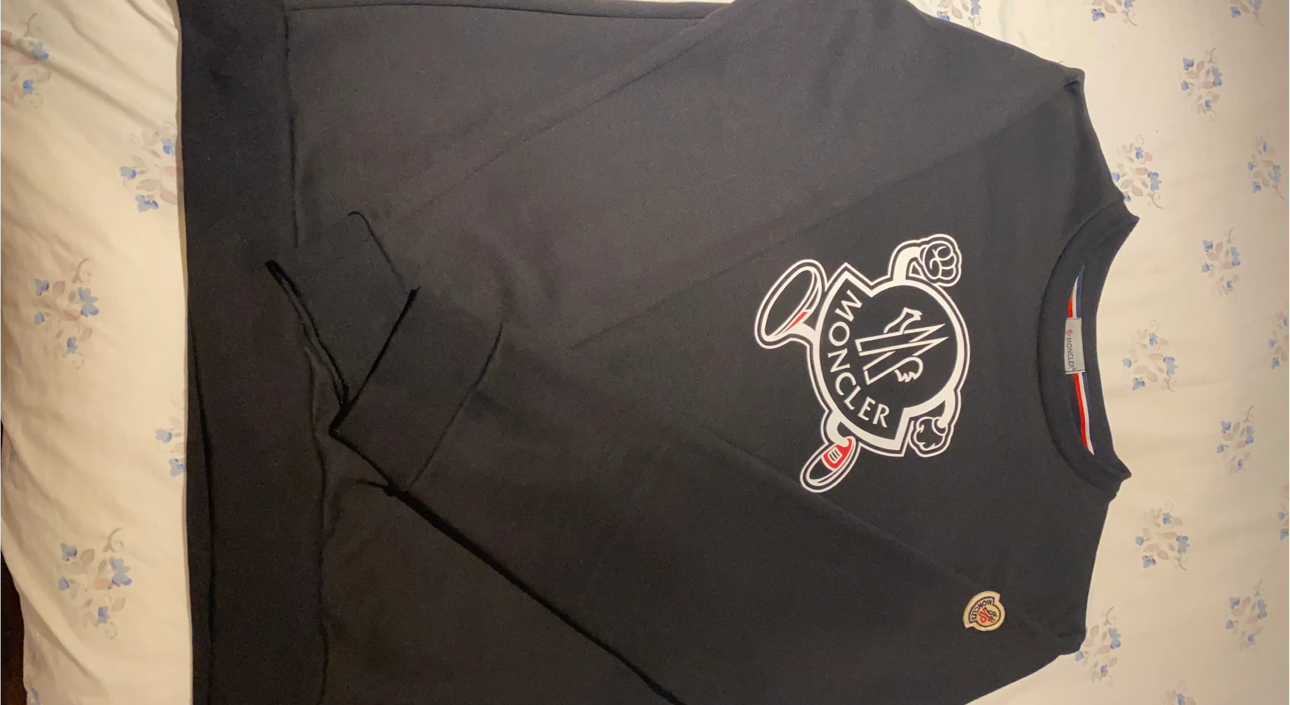 This is a black crewneck sweatshirt from Moncler. It features the brand's signature logo graphic on the front. It's made of a comfortable material for everyday wear.
