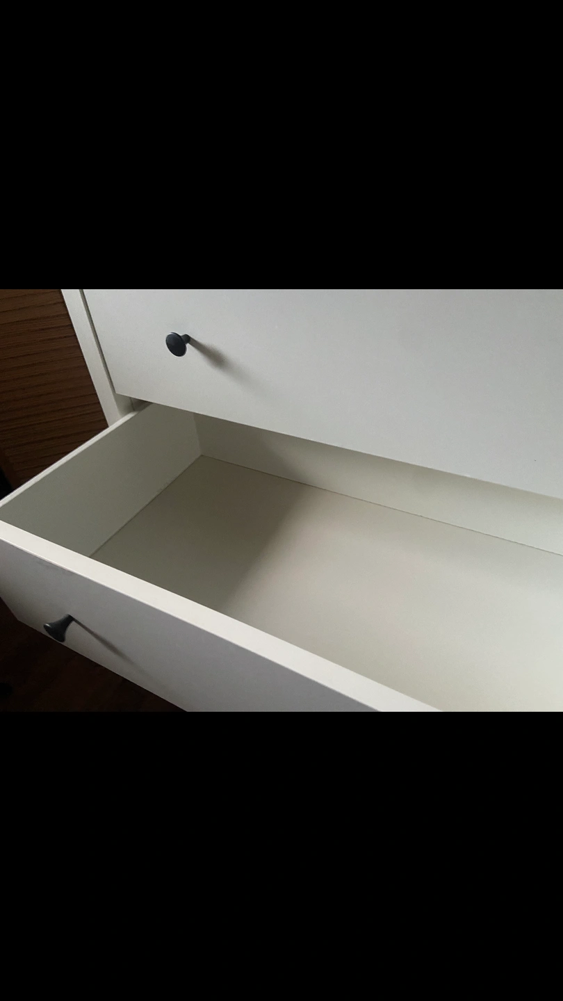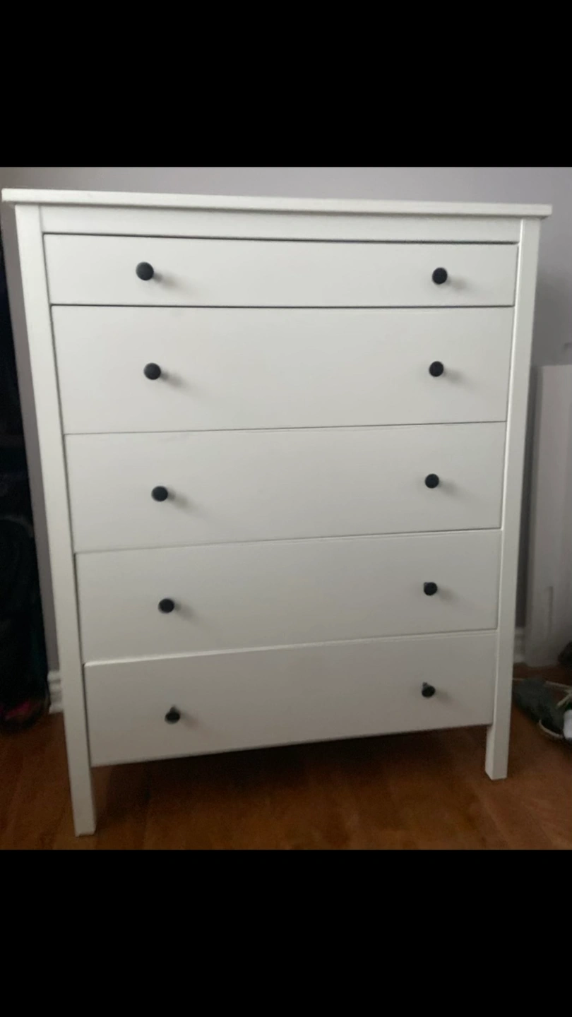 White 5-drawer dresser in great condition. Drawers slide smoothly and the frame is solid and sturdy. There’s minor water damage on the top and a couple of the drawer fronts—purely cosmetic (see photos).