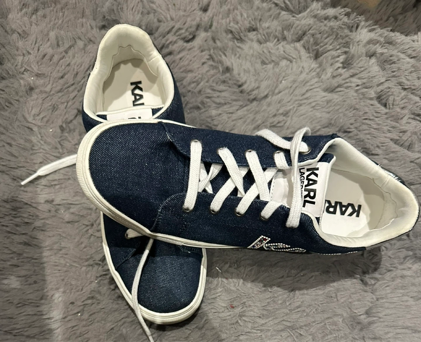 These Karl Lagerfeld Paris sneakers are made of denim. They feature white laces and silver accents on the heel. A stylish addition to any casual outfit!