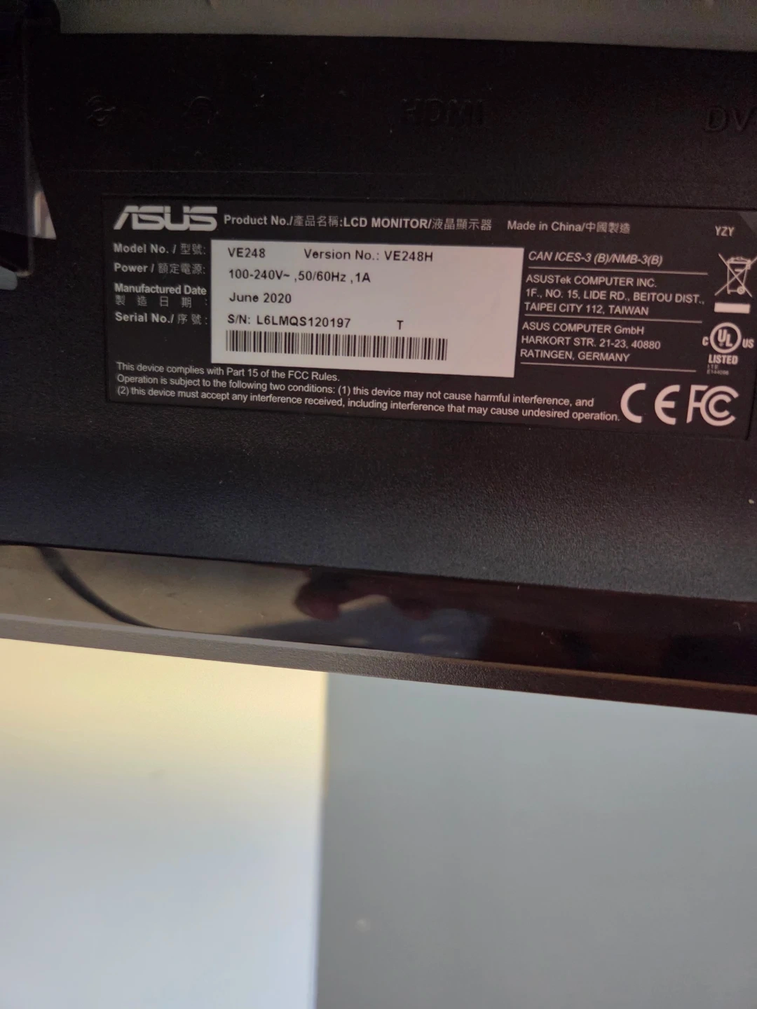 ASUS VE248H LCD Monitor. Manufactured June 2020. Power requirement: 100-240V~, 50/60Hz, 1A. It's a 24-inch display.