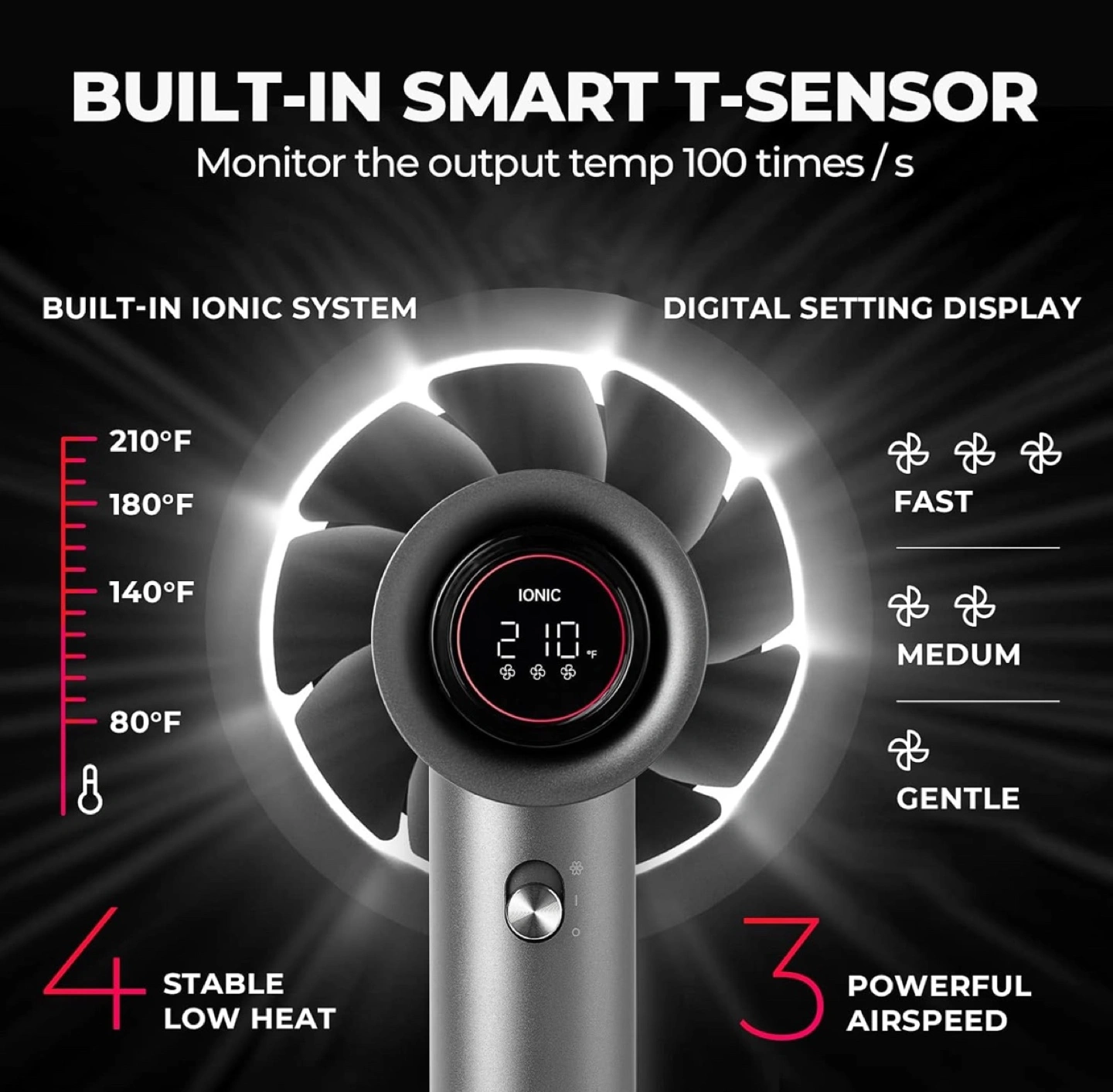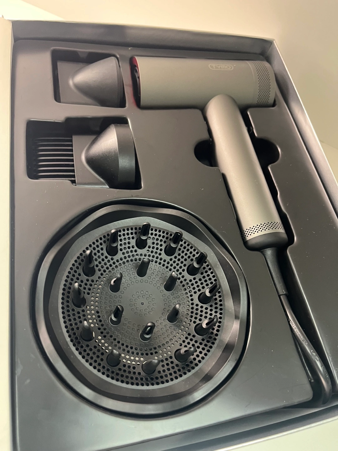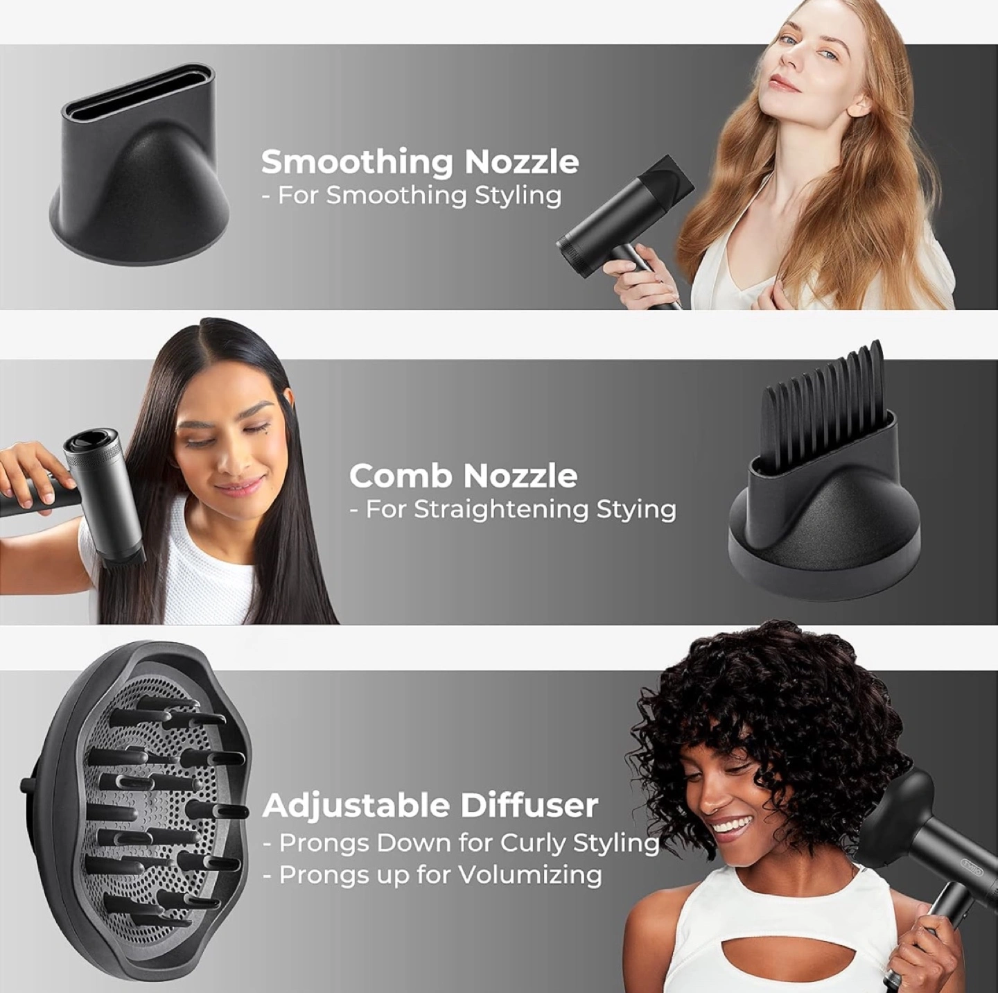 289Powerful hair dryer. Features three attachments: smoothing nozzle, comb nozzle, and adjustable diffuser. Digital display shows temperature settings. Smart T-sensor monitors output temperature. Includes storage bag.