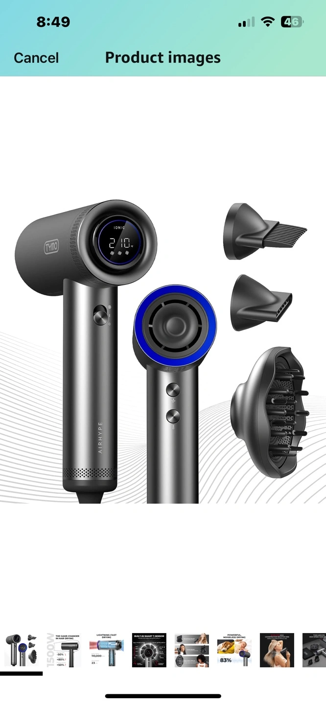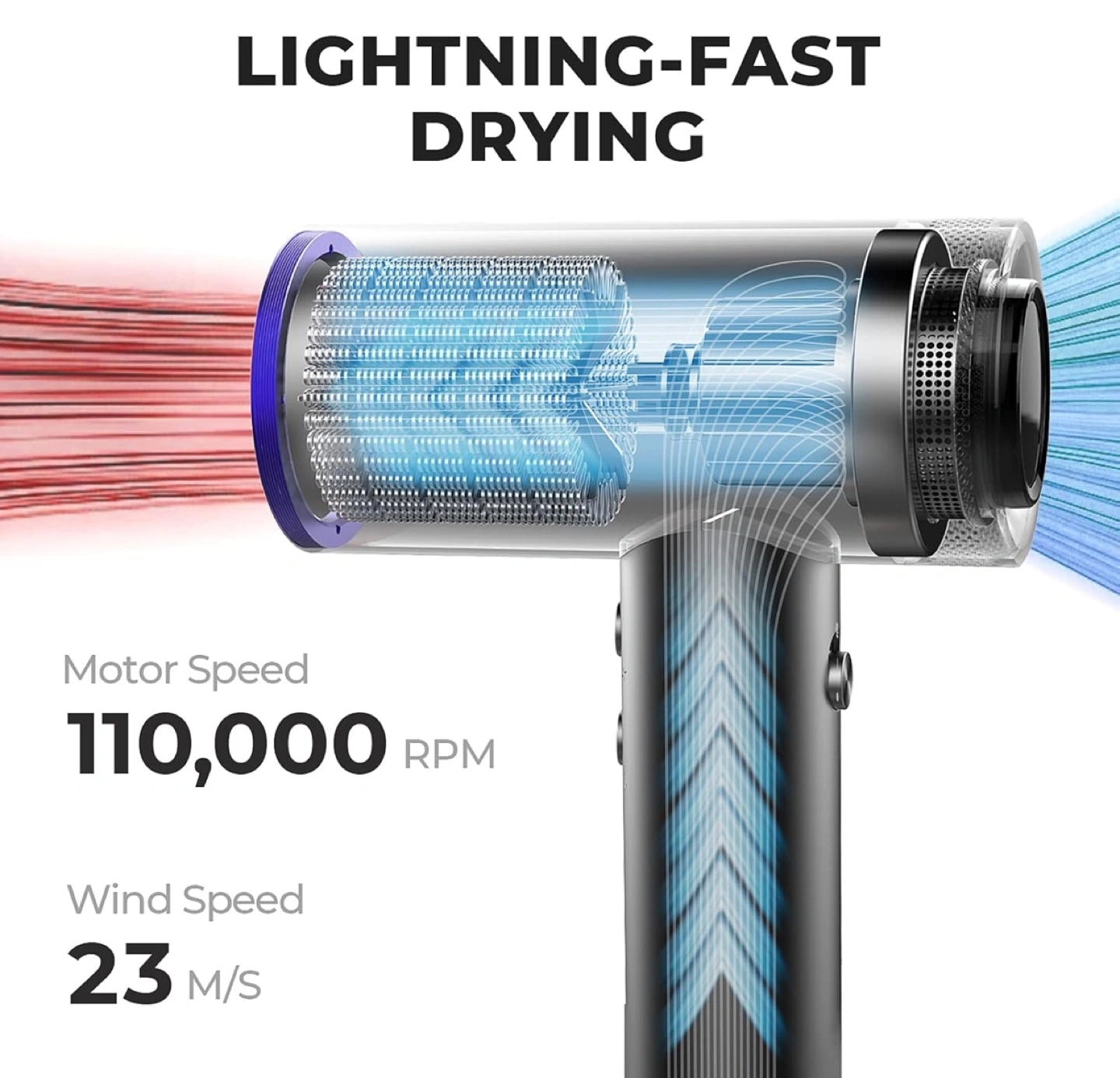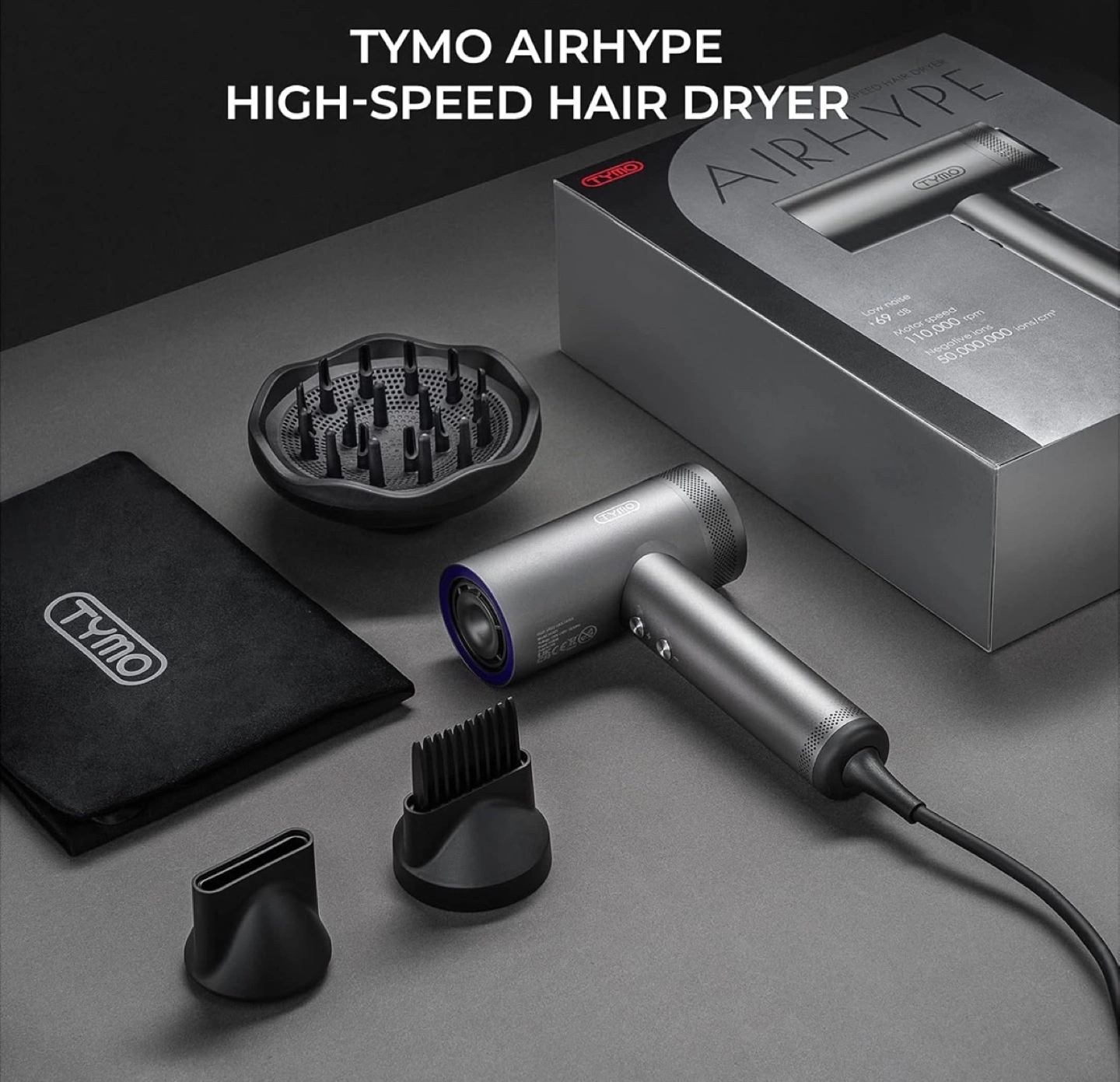 289Powerful hair dryer. Features three attachments: smoothing nozzle, comb nozzle, and adjustable diffuser. Digital display shows temperature settings. Smart T-sensor monitors output temperature. Includes storage bag.