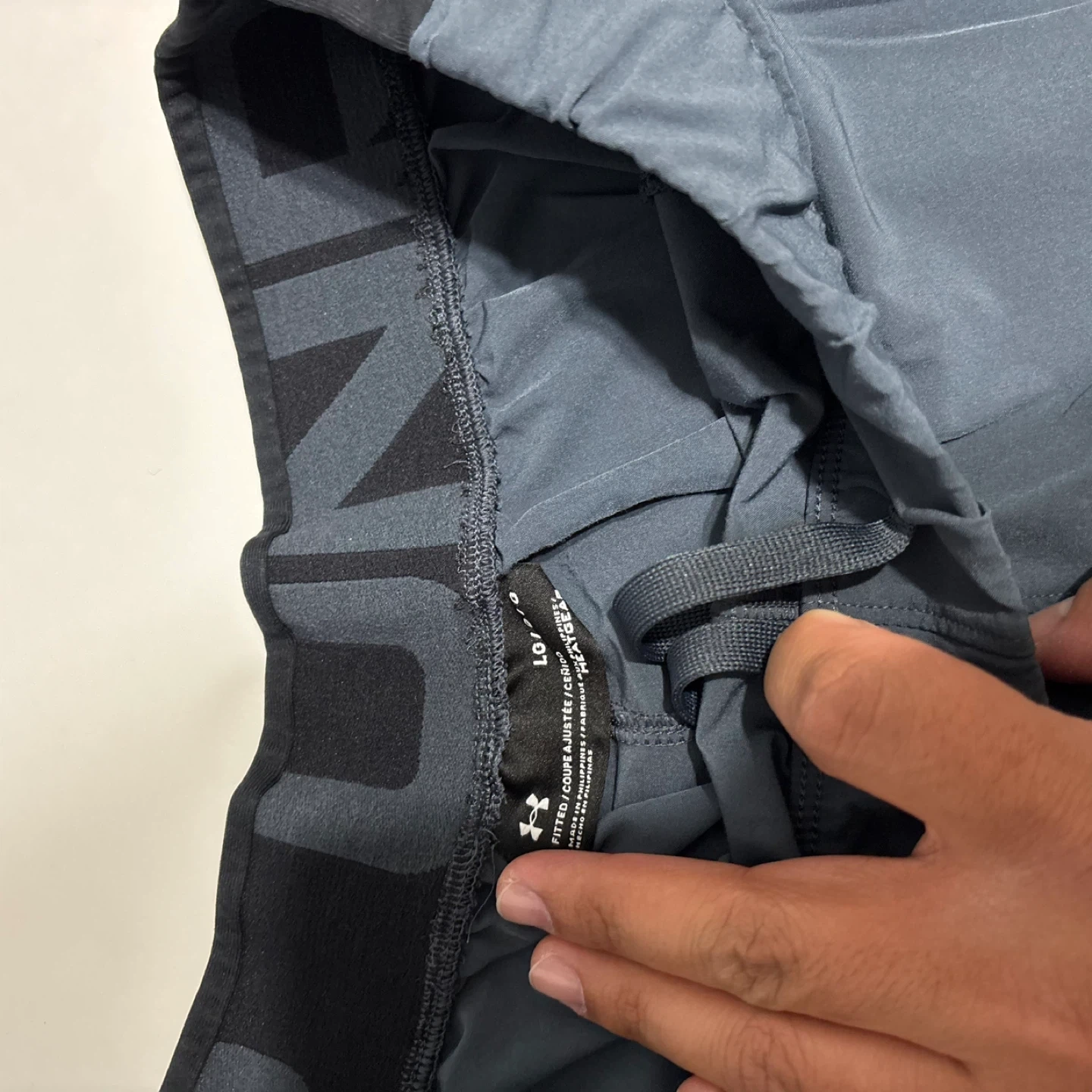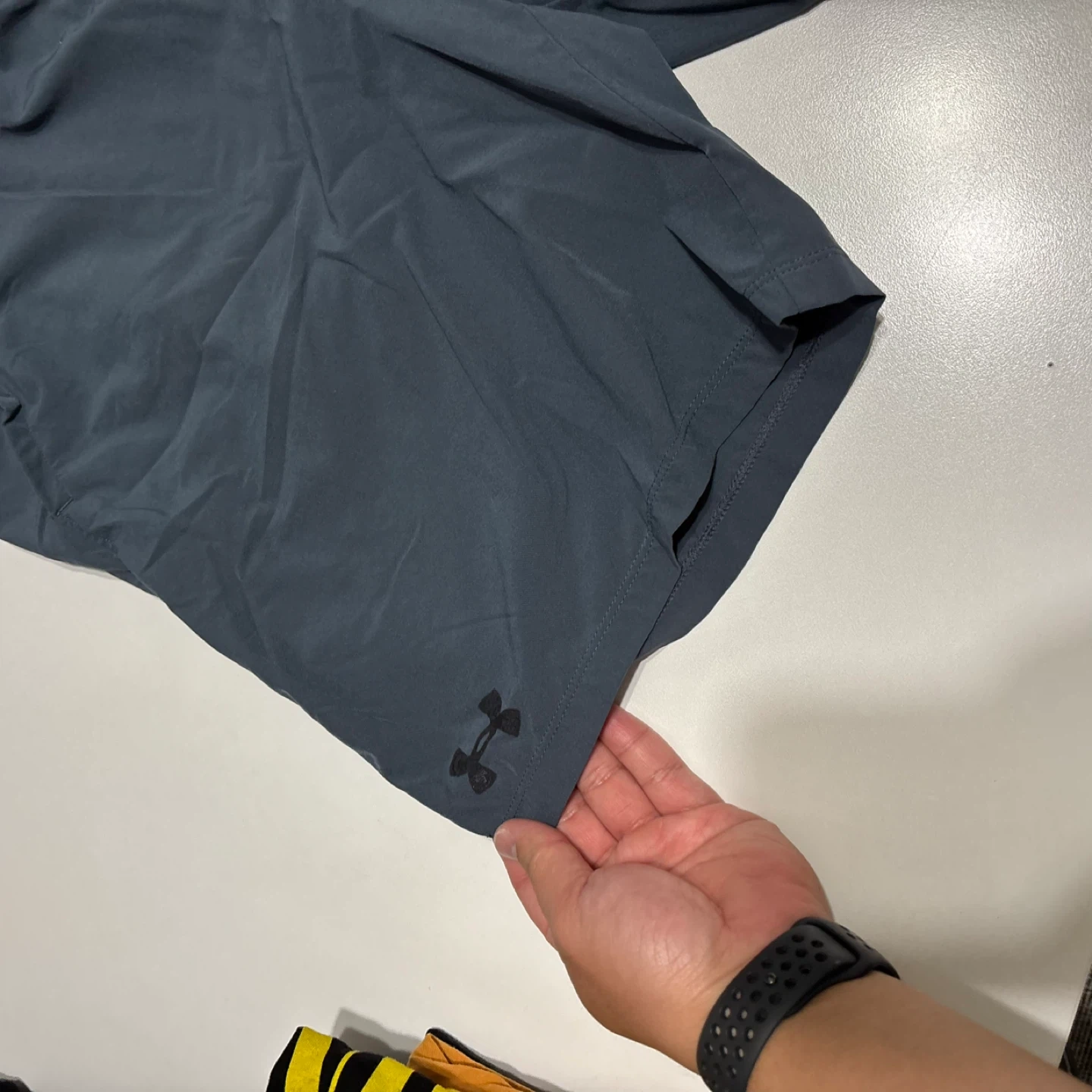 Under Armour men's grey athletic shorts. Size LG. They're made with a lightweight, quick-drying fabric and feature an elastic waistband with a drawstring. Perfect for workouts!
