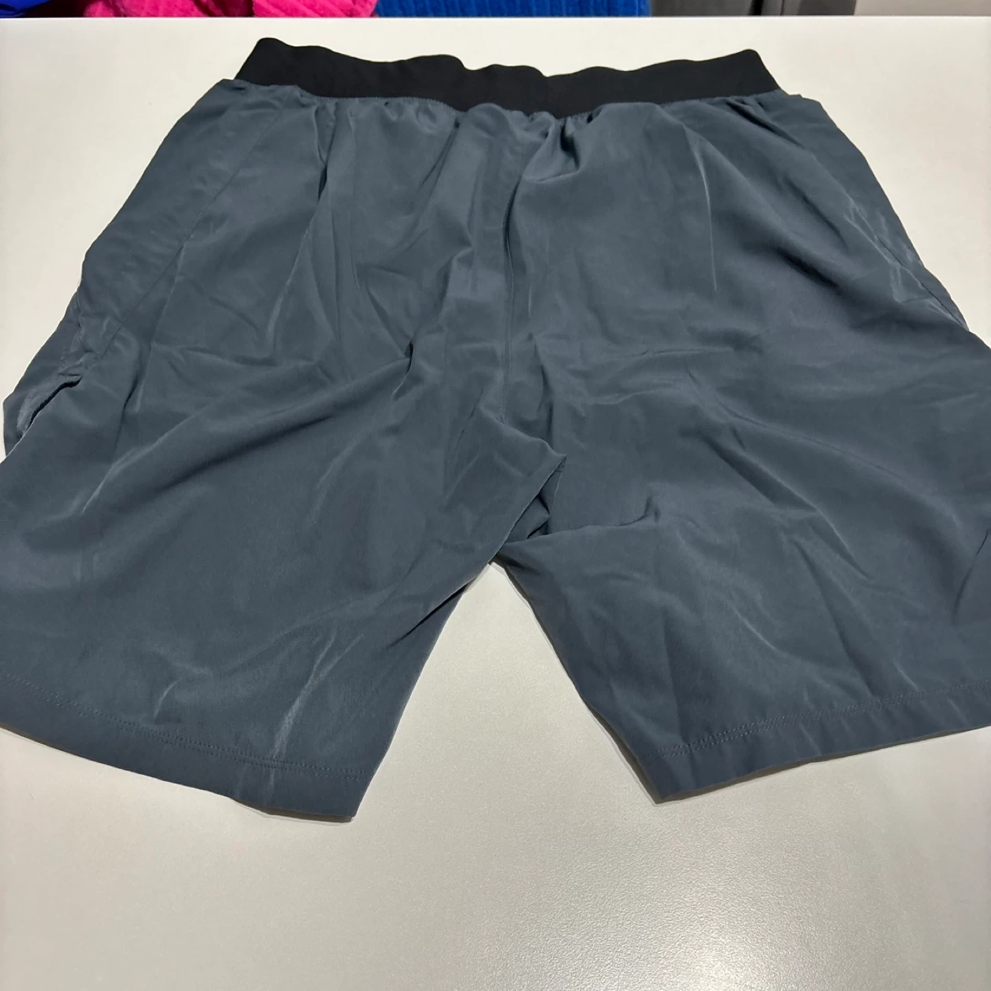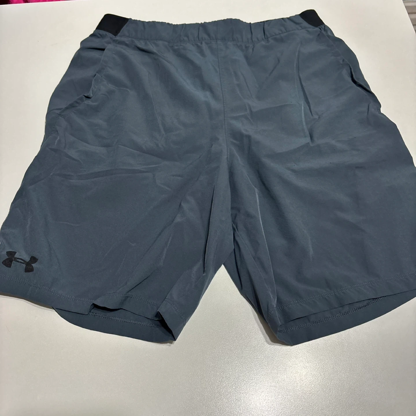 Under Armour men's grey athletic shorts. Size LG. They're made with a lightweight, quick-drying fabric and feature an elastic waistband with a drawstring. Perfect for workouts!