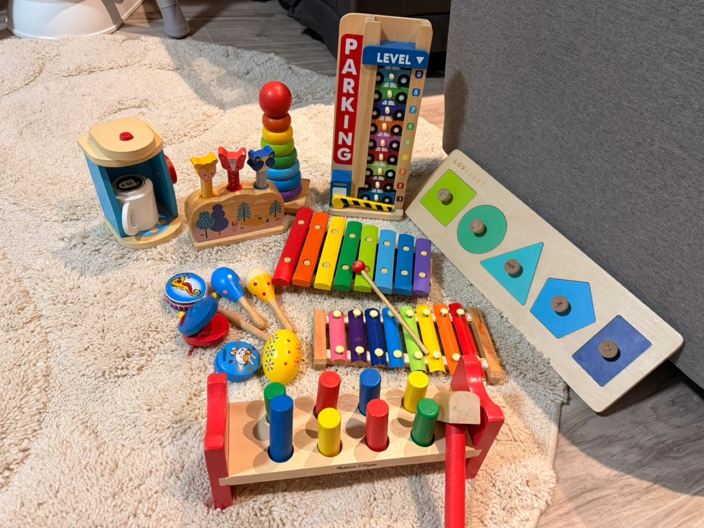 This bundle includes a variety of wooden educational toys. Features include a xylophone, shape sorter with geometric shapes, a stacking ring toy, a pounding bench with pegs, and a toy coffee maker. Most toys are brightly colored to engage young children.