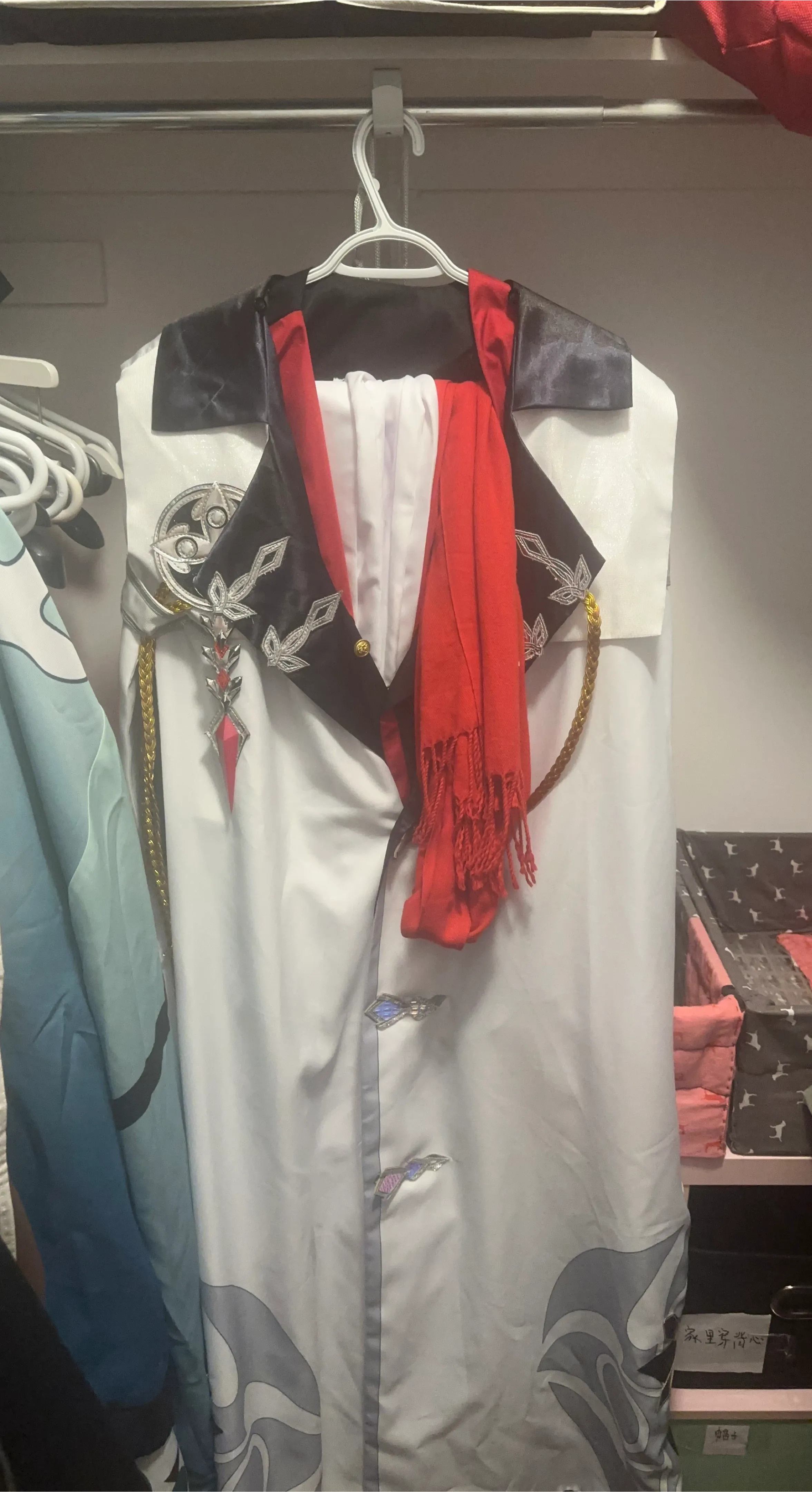 This costume set includes a white garment with black and red accents. It also comes with a red fringed scarf and decorative gold chain. Some decorative pins are attached to the garment. It's a unique outfit for special occasions.