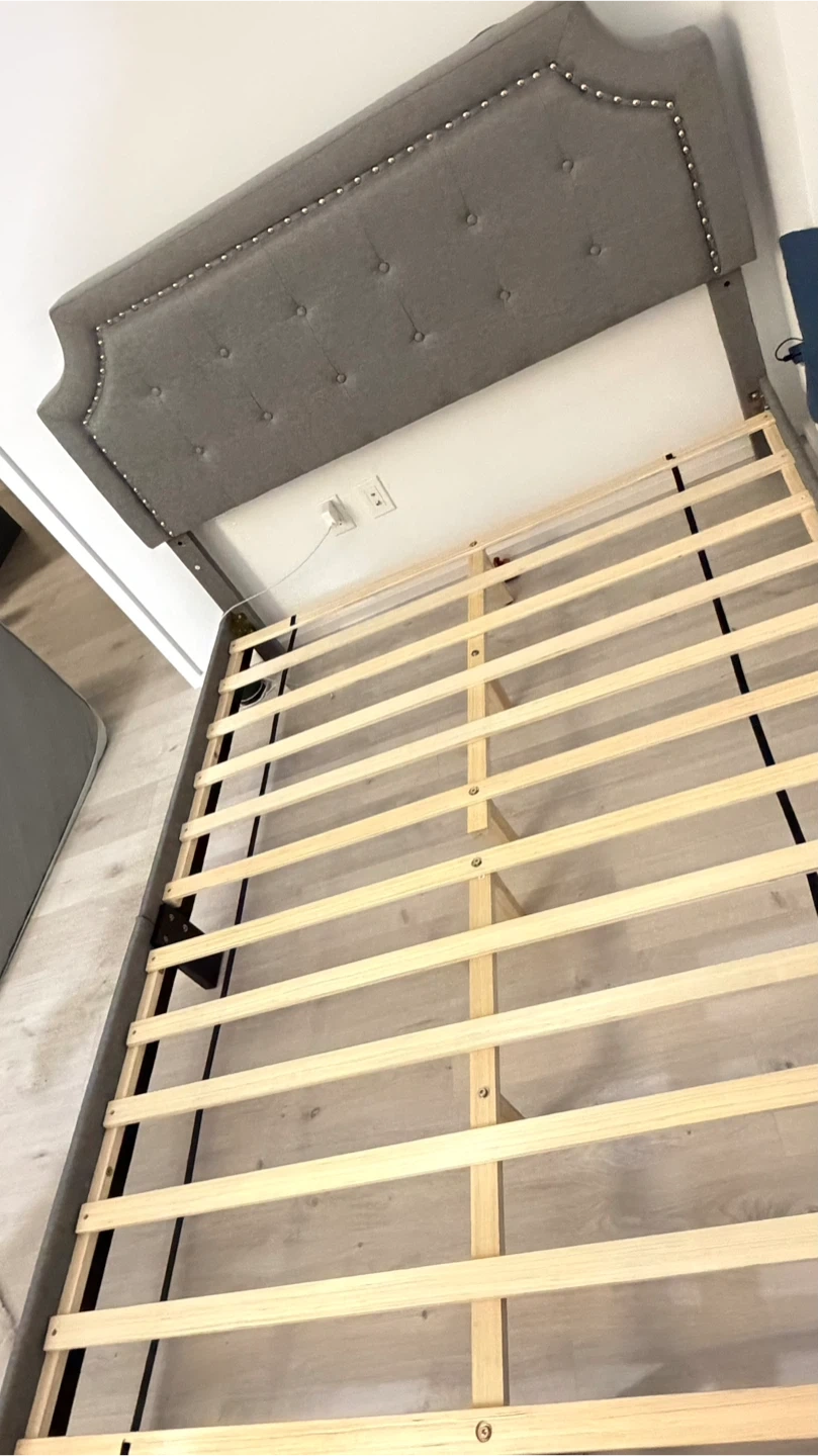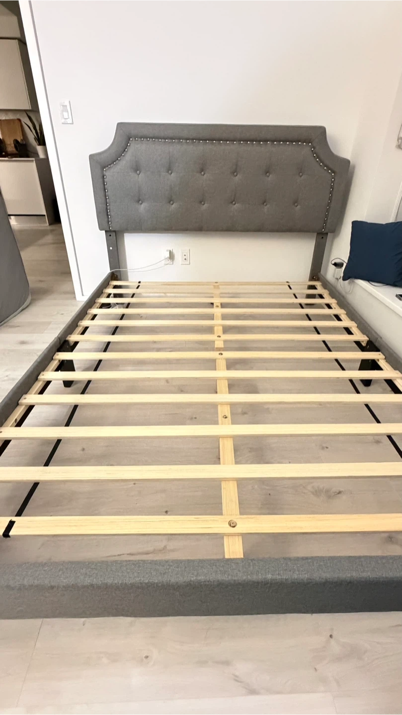 Grey upholstered bed frame with a tufted headboard. It features a wooden slat support system. This queen-sized bed frame is upholstered in a durable fabric.