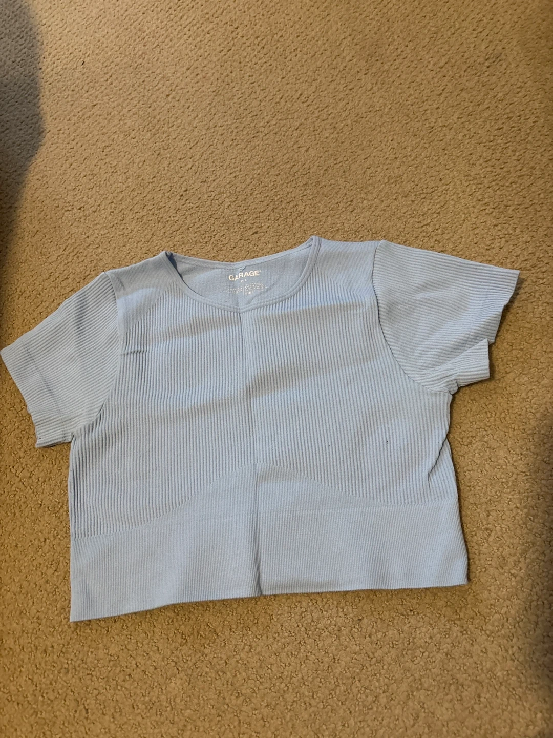 Garage blue ribbed cropped t-shirt. It's a size small with short sleeves. The material is stretchy and comfortable.