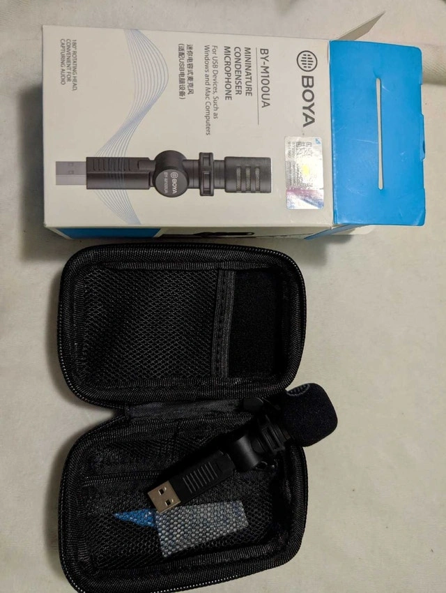Capture crystal-clear audio with this Boya BY-M100UA miniature condenser microphone, perfect for USB devices and computers. This microphone is brand new with box and comes with a case. Specifications: Type: Miniature USB Condenser Microphone, Polar Pattern: Omni-directional, Frequency Response: 50Hz-18kHz, Sensitivity: -36dB±2dB(0dB=1V/Pa,at 1KHz), Signal to Noise Ratio: 78dB, Output: USB. For Sale By: Owner.