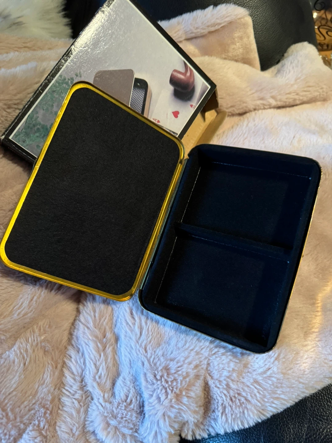 This is a brass playing card case from Woodward's. It's designed to hold a deck of cards and comes with dividers inside. The case has a decorative Ace of Hearts design on the lid. It's a handy accessory for keeping your cards protected!