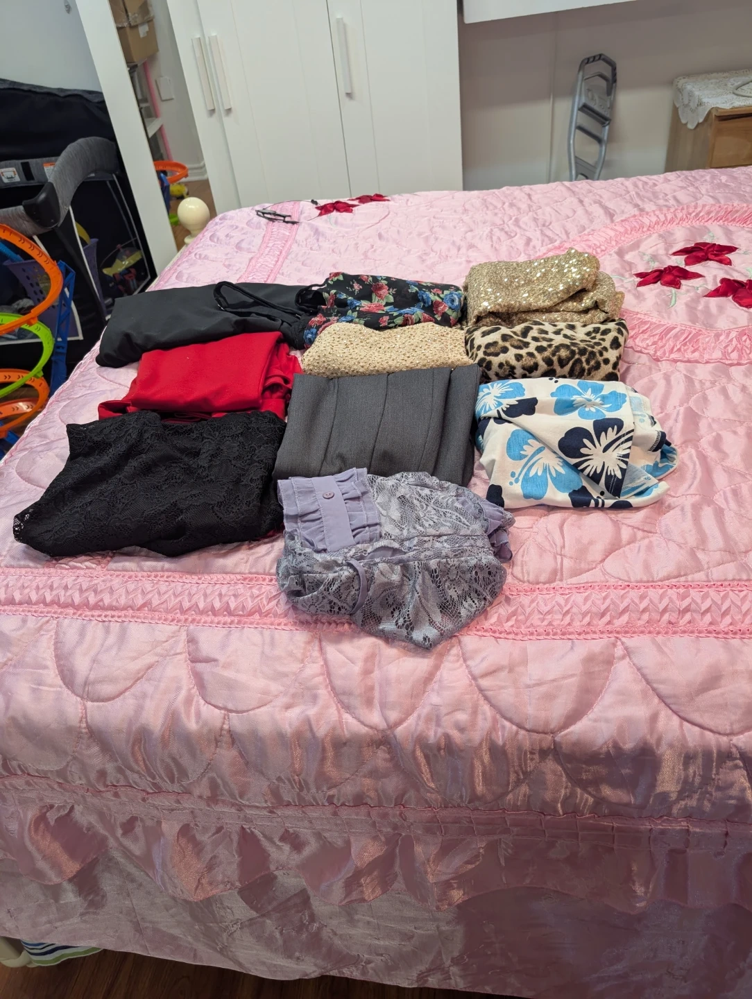 A collection of various women's apparel including tops and pants. Items feature different patterns and textures like floral, leopard print, sequins, and lace. Includes solid colours like black and red, as well as patterned designs. This bundle offers versatile options for different occasions.