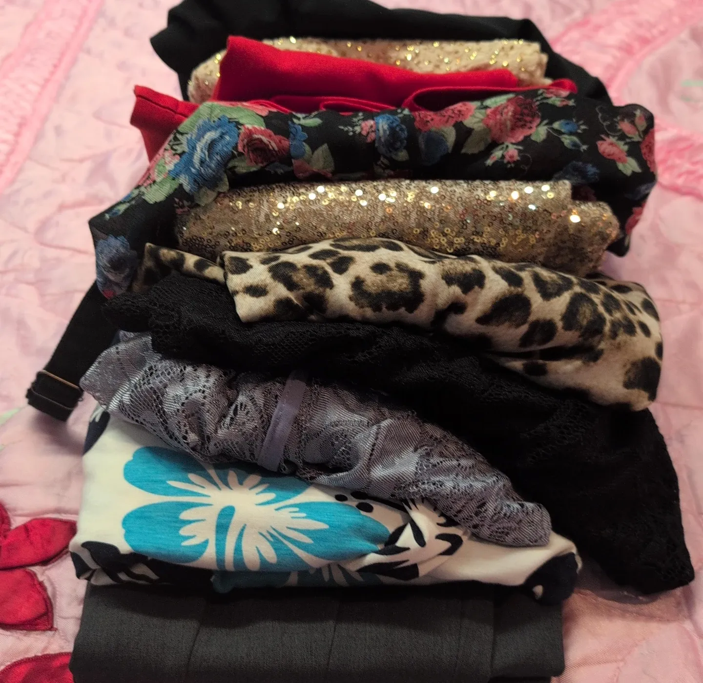 A collection of various women's apparel including tops and pants. Items feature different patterns and textures like floral, leopard print, sequins, and lace. Includes solid colours like black and red, as well as patterned designs. This bundle offers versatile options for different occasions.
