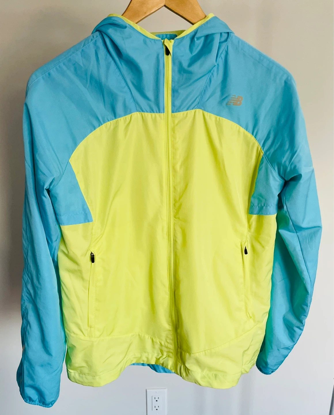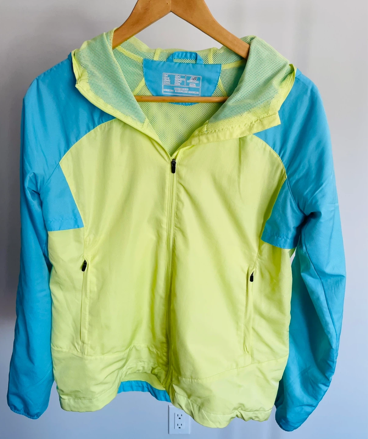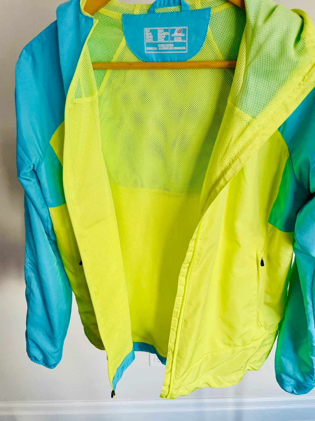 Lightweight New Balance running waterproof jacket with a full zip closure and hood. Features a breathable mesh lining and two zippered hand pockets. Colour-blocked design in bright blue and neon yellow.