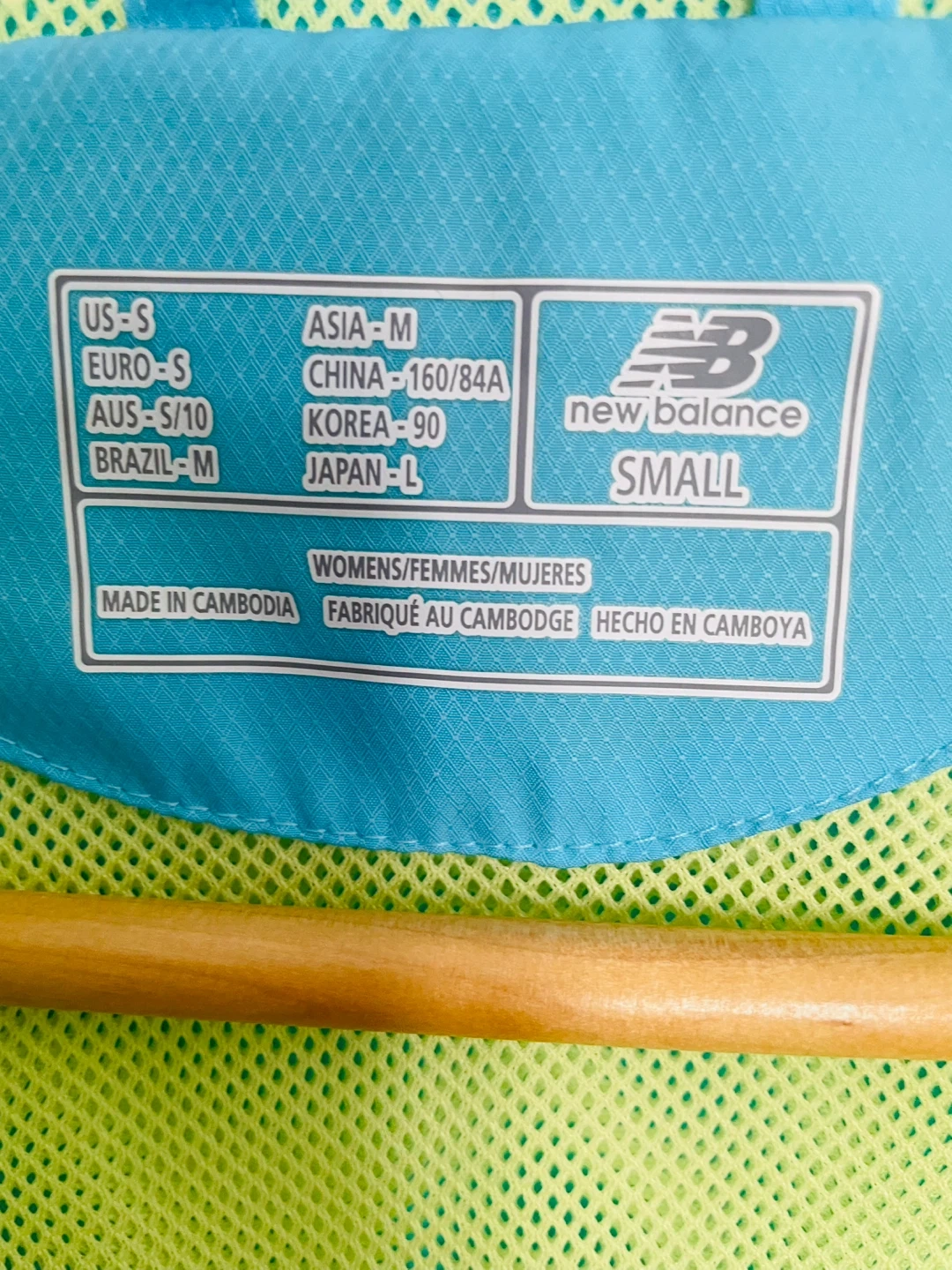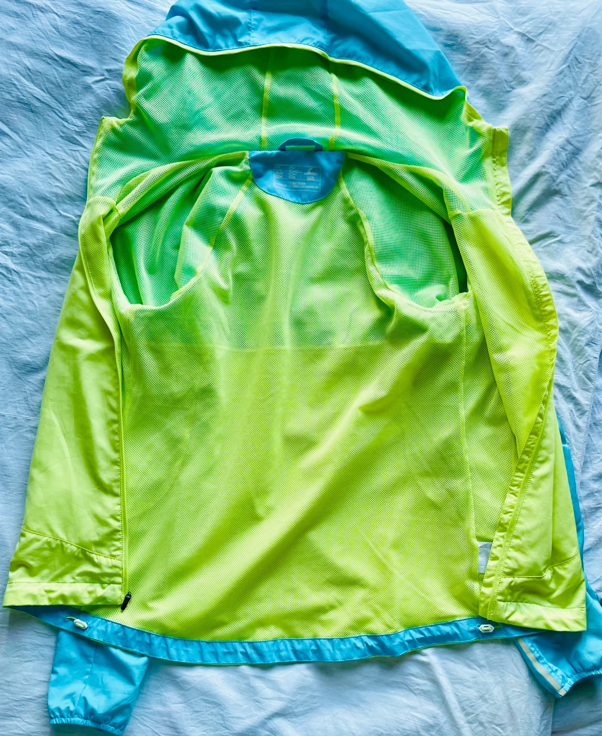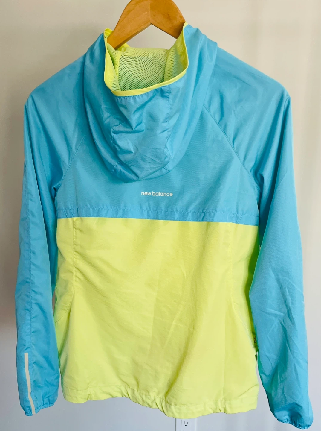 Lightweight New Balance running waterproof jacket with a full zip closure and hood. Features a breathable mesh lining and two zippered hand pockets. Colour-blocked design in bright blue and neon yellow.