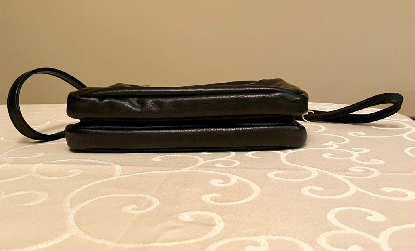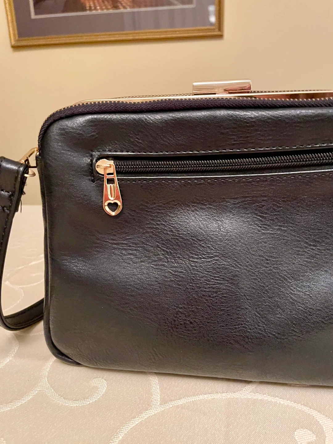High quality womenβs Long & Son black faux leather handbag with gold accents.