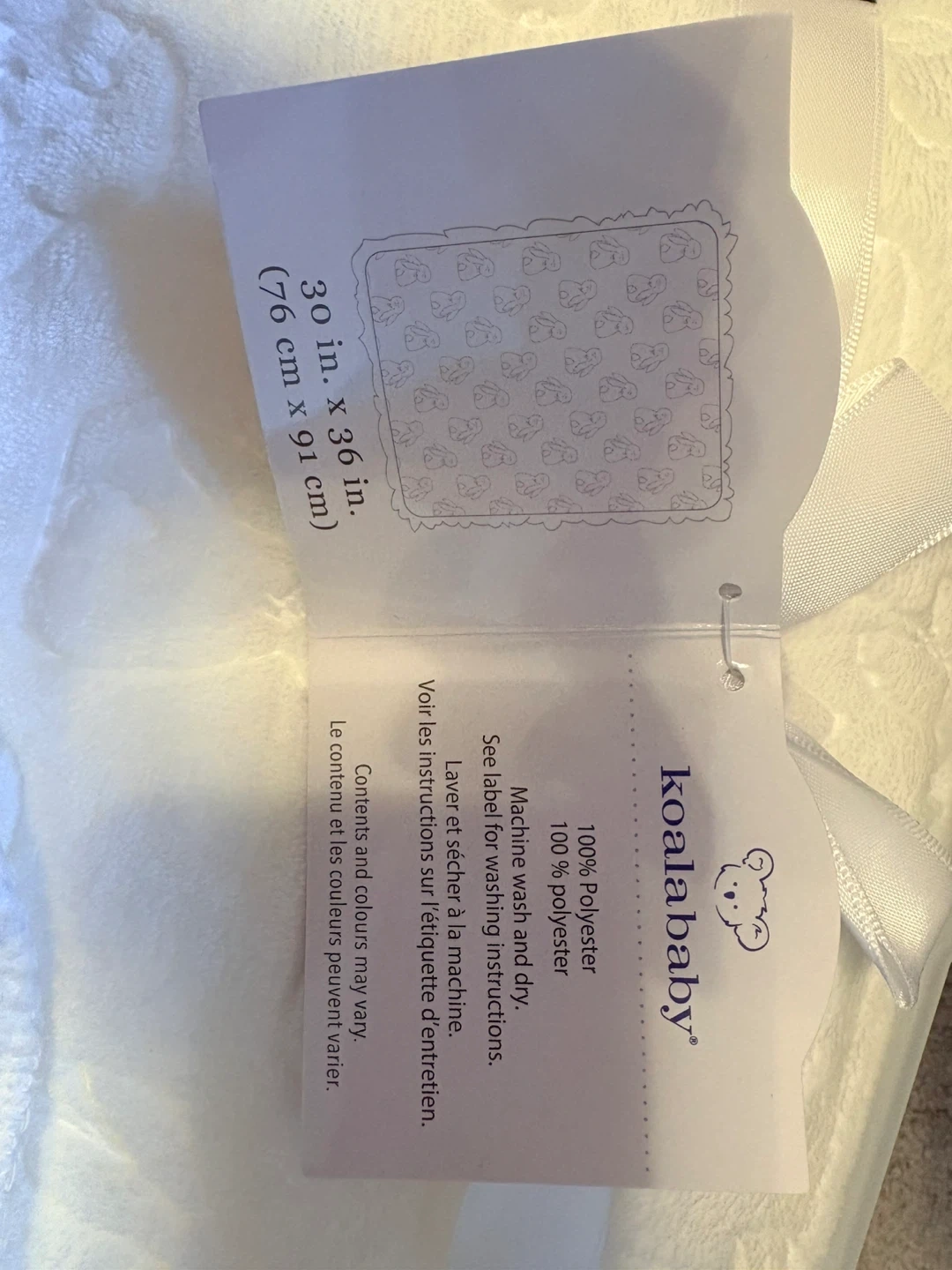 This is a white, reversible baby blanket from Koala Baby. It's made from 100% polyester and measures 30 in. x 36 in. (76 cm x 91 cm). Machine wash and dry.
