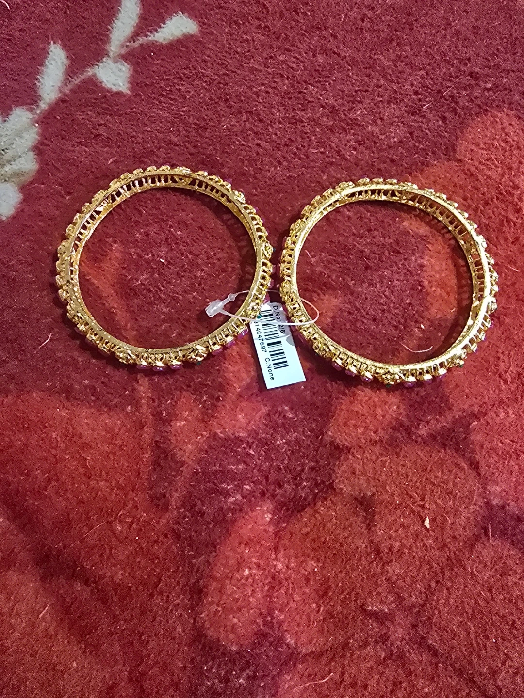 A pair of intricate gold tone bangles, embellished with vibrant red and green stones. These bangles add a touch of elegance to any outfit. Perfect for special occasions or everyday wear.