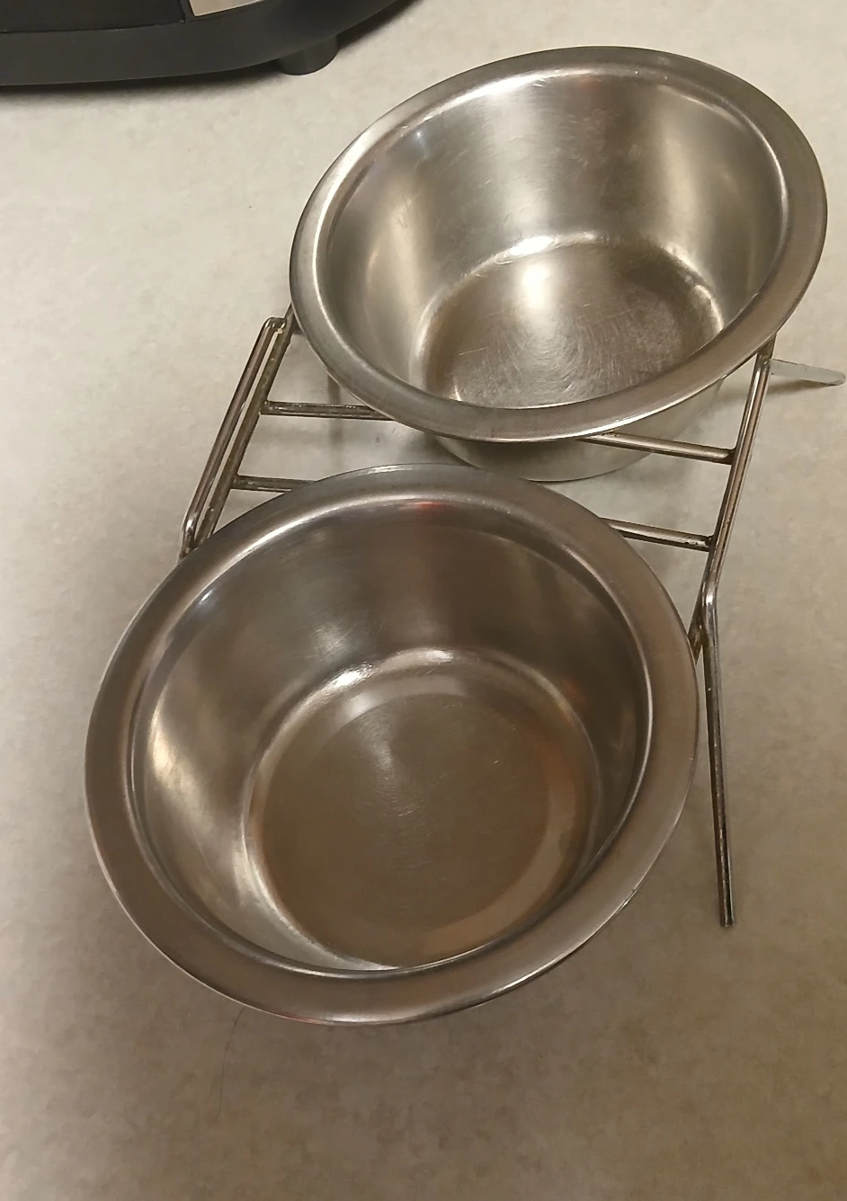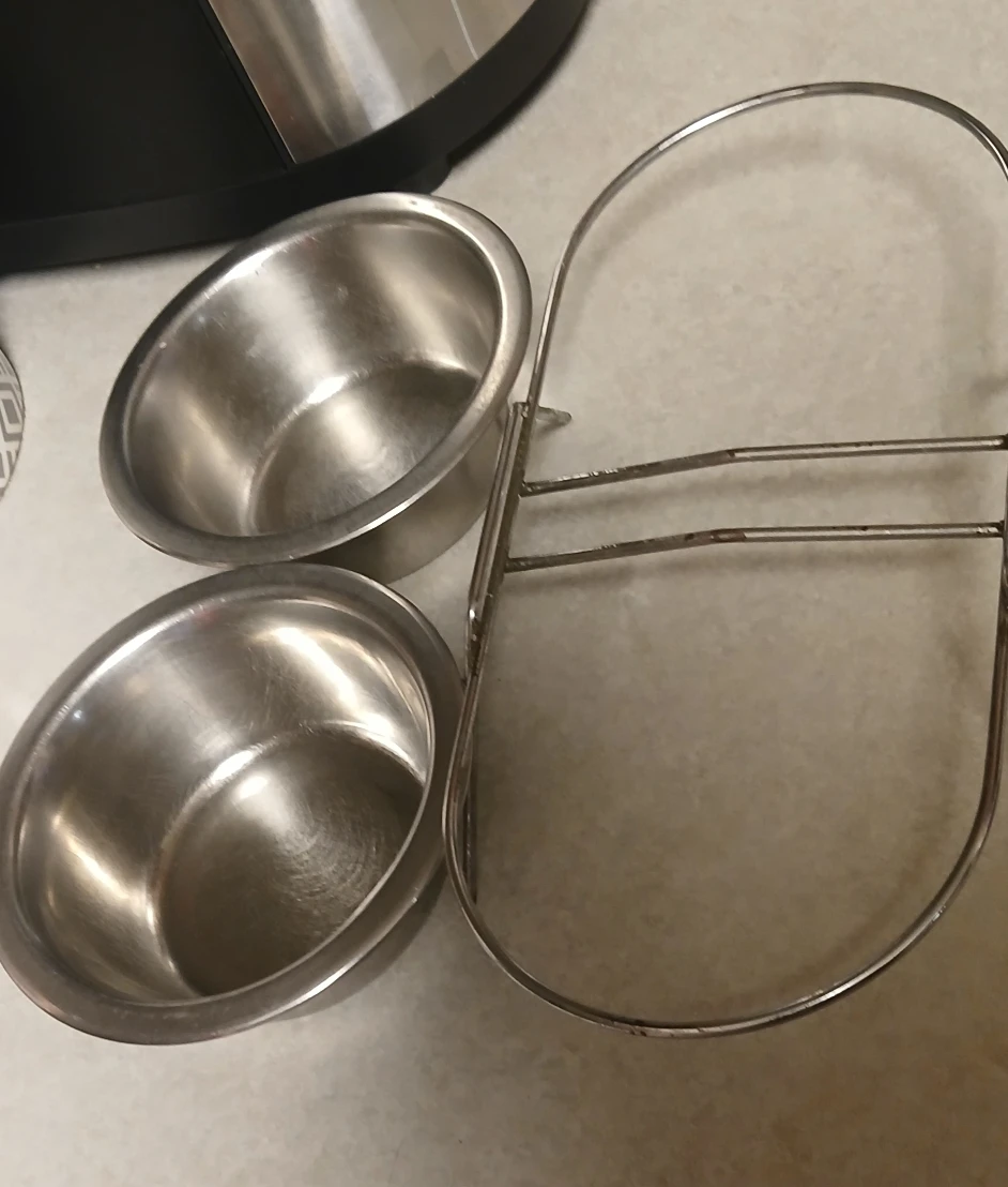 a set of stainless steel double pet bowls with a stand. These bowls are perfect for food and water, and the stand helps keep them in place. They are in good condition and ready for a new home!