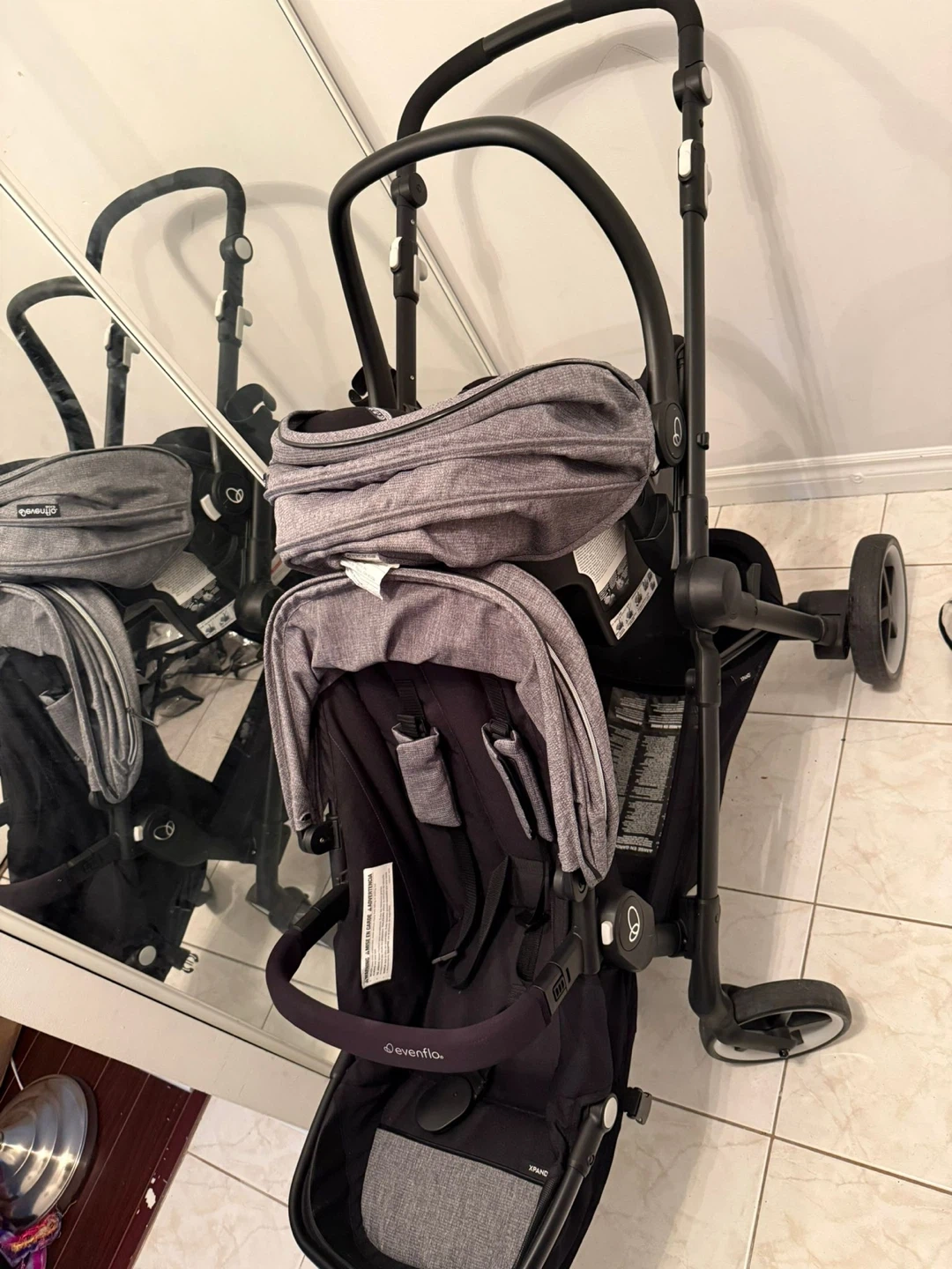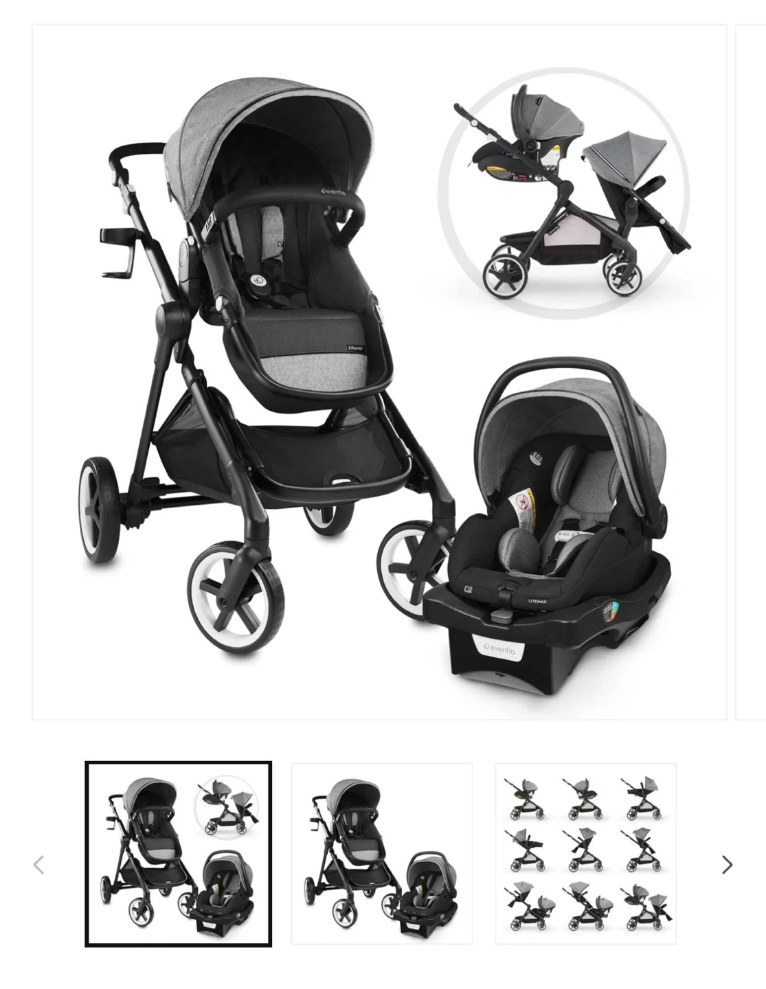 An Evenflo gold sensor safe pivot expand smart travel system with infant car seat. It has 2 seats for both a baby and a toddler at the same time. Still new and only used for 2 months.