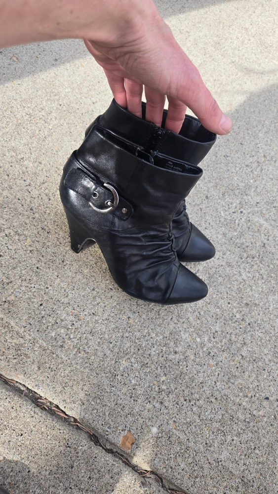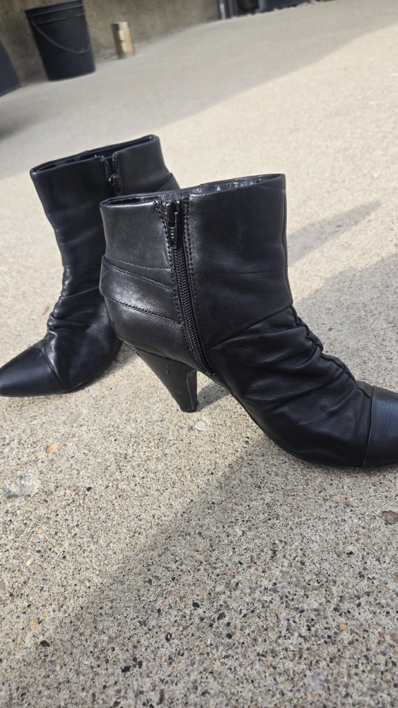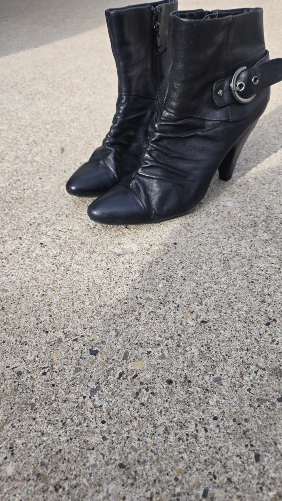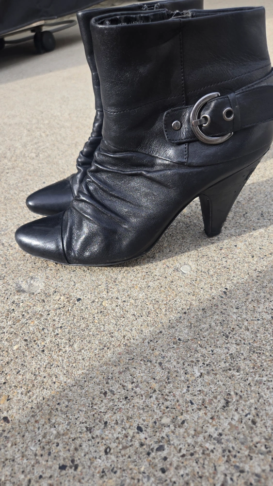 Selling a pair of black leather ankle boots in women's size 8 (38M). These stylish boots feature a unique heel and a decorative buckle. The upper material is genuine leather, with a lining of textile/PU. The outer sole is made of man-made materials. They're perfect for adding a bit of edge to any outfit!