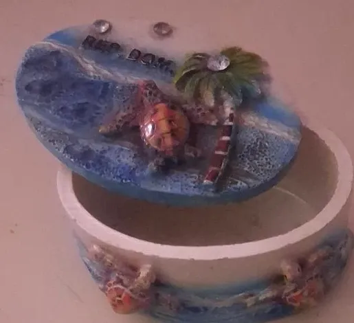 Dominican Republic Trinket box featuring a beach scene with sea turtles and a palm tree. Lid is decorated with waves, a turtle, and palm tree. It's a decorative piece with a tropical theme. Perfect for holding small jewelry or keepsakes!