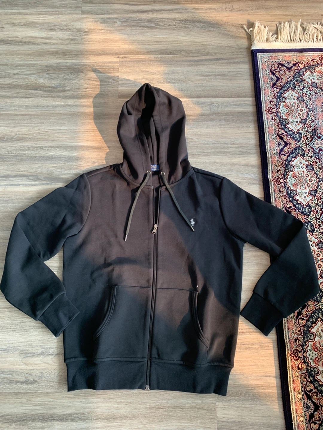 Selling a black Polo Ralph Lauren full zip hoodie. It's in great condition and perfect for layering or wearing on its own. The classic Polo logo is embroidered on the chest, adding a touch of style to this comfortable hoodie.