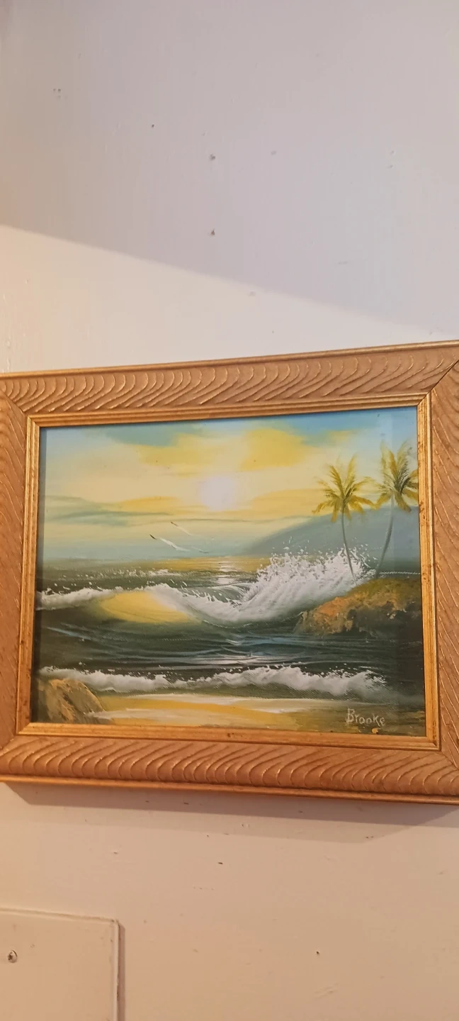Authentic Signed " Brooke " Oil Painting Framed in Wooden Frame . Oil on canvas painting of a tropical ocean scene with palm trees and crashing waves. Signed "Brooke" in the lower right corner. Framed in a textured gold-tone wood frame. 12"×10". Excellent condition. ALL MY PRICES ARE NEGOTIABLE !!