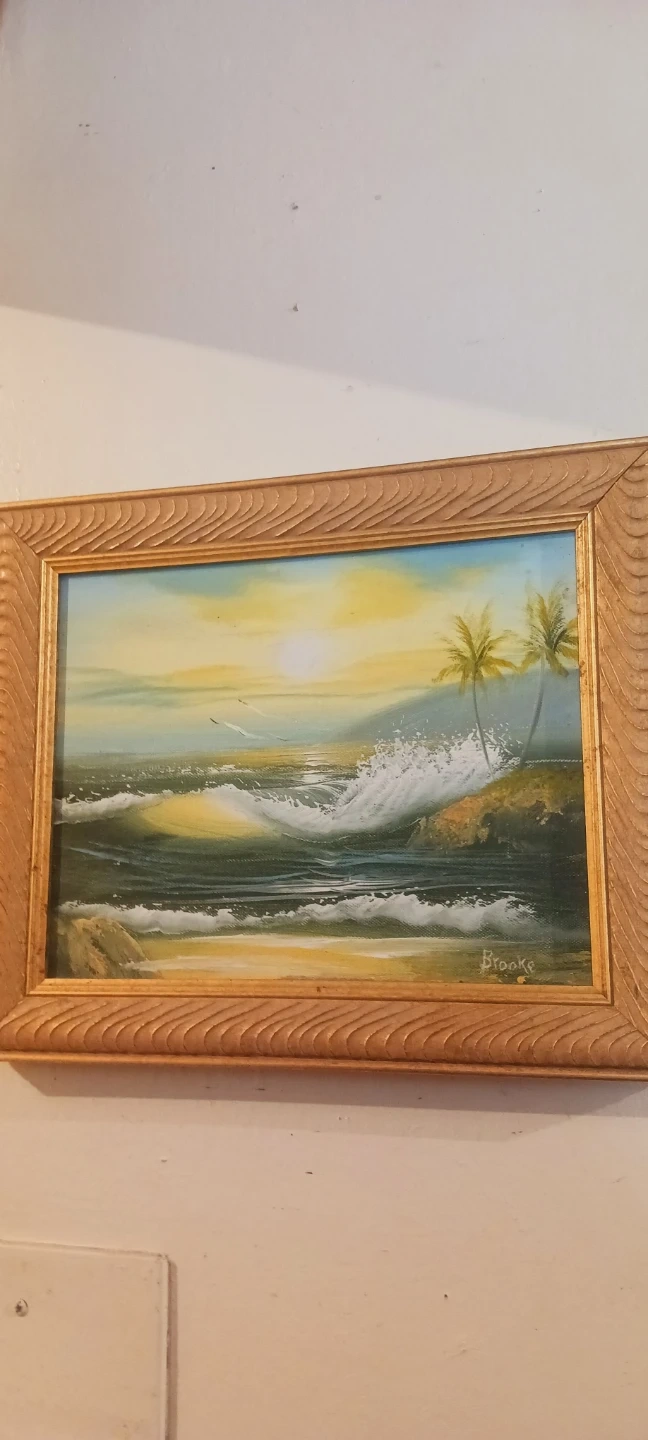Authentic Signed " Brooke " Oil Painting Framed in Wooden Frame . Oil on canvas painting of a tropical ocean scene with palm trees and crashing waves. Signed "Brooke" in the lower right corner. Framed in a textured gold-tone wood frame. 12"×10". Excellent condition. ALL MY PRICES ARE NEGOTIABLE !!
