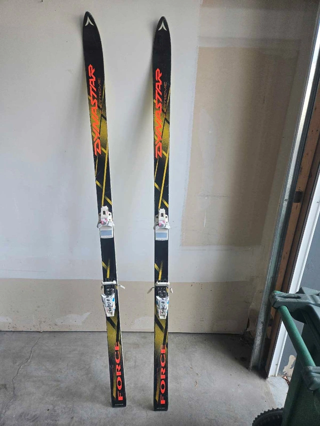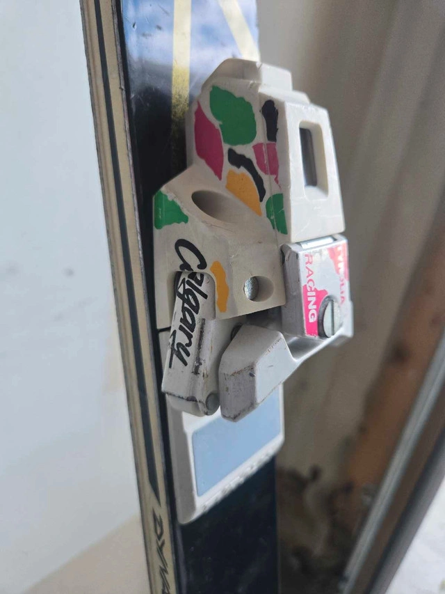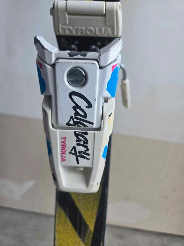 Vintage Tyrolia Calgary 88 bindings, a real find for ski collectors! These bindings are in used condition, showing their age with some cosmetic wear, but still holding that classic charm. Perfect for adding a retro touch to your ski setup or displaying as a piece of ski history. These Tyrolia Calgary 88 bindings will definitely turn heads on the slopes or in your collection. Attached to a free pair of dynastar extreme force racing skis 185 cm. If the ad is up, they're still available!