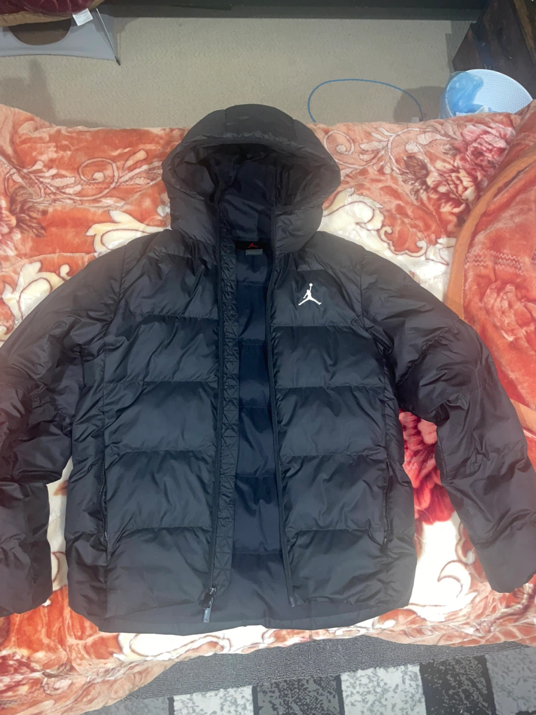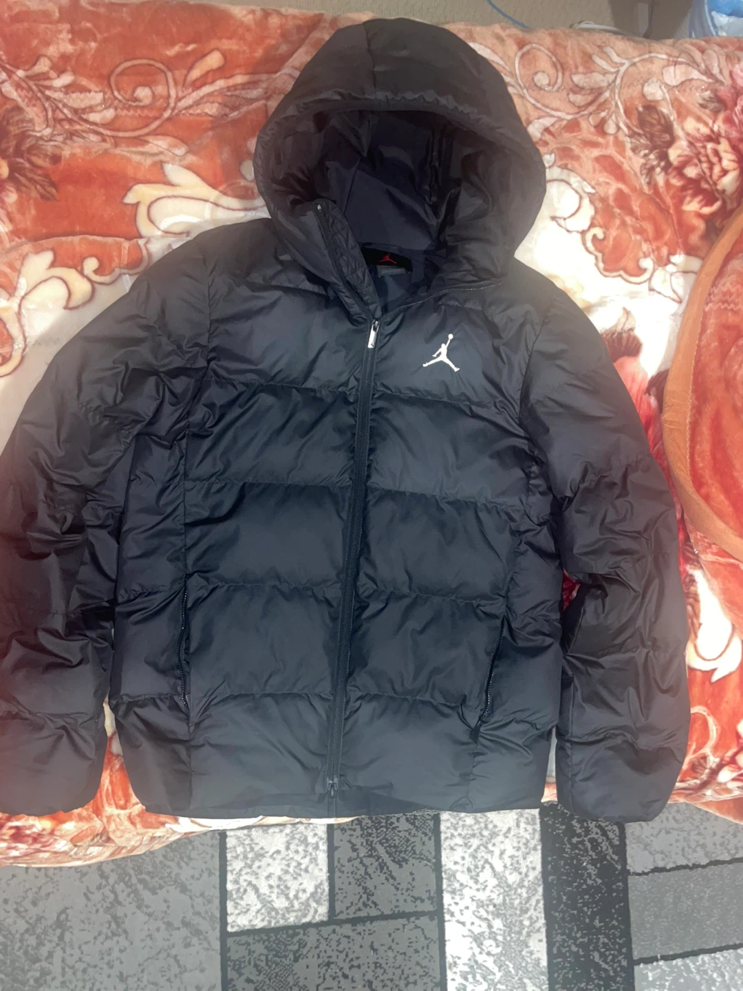 Selling a black Jordan puffer jacket. It's in great condition and ready to keep you warm! It features the iconic Jordan logo and a comfortable, stylish fit. Perfect for those chilly days!
