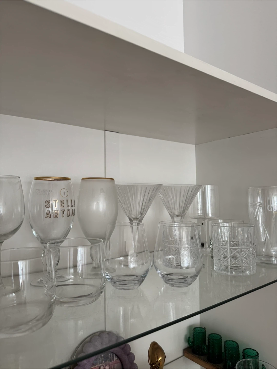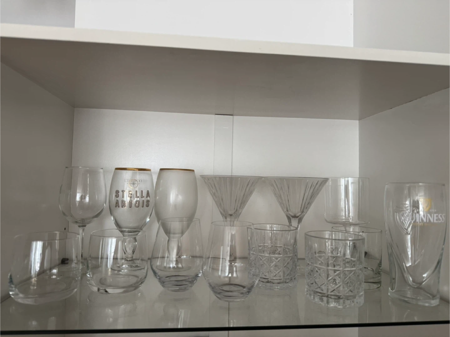A collection of assorted drinkware featuring branded glasses from Stella Artois, Guinness, cocktails glass set, wine glasses, shot glasses, some with decorative etched patterns. Great for entertaining or themed parties!